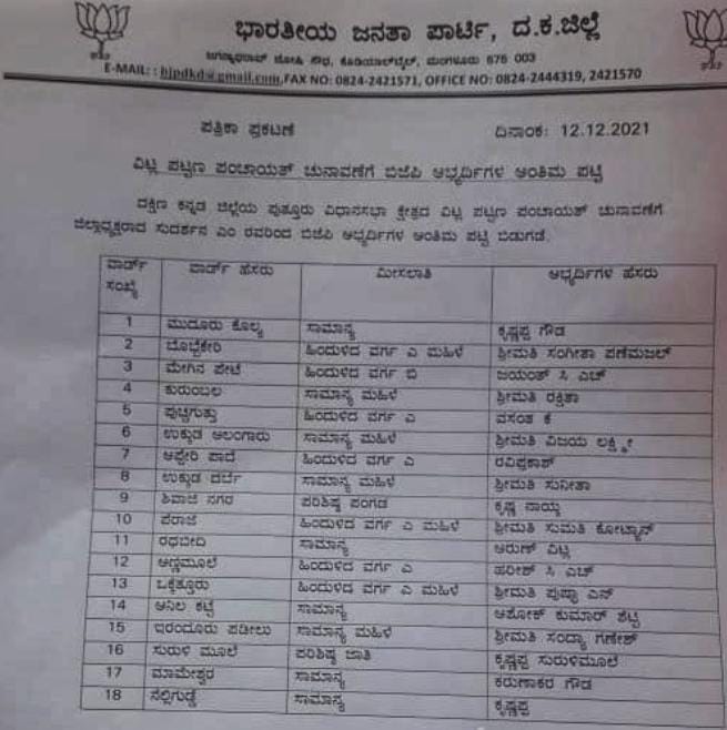 ವಿಟ್ಲ : ವಿಟ್ಲ ಪಟ್ಟಣ ಪಂಚಾಯತ್ ಚುನಾವಣೆಗೆ ಬಿಜೆಪಿ ಅಭ್ಯರ್ಥಿಗಳ ಪಟ್ಟಿಯನ್ನು ಬಿಜೆಪಿ ಜಿಲ್ಲಾಧ್ಯಕ್ಷ ಸುದರ್ಶನ ಮೂಡುಬಿದಿರೆ ಬಿಡುಗಡೆ ಮಾಡಿದ್ದಾರೆ.