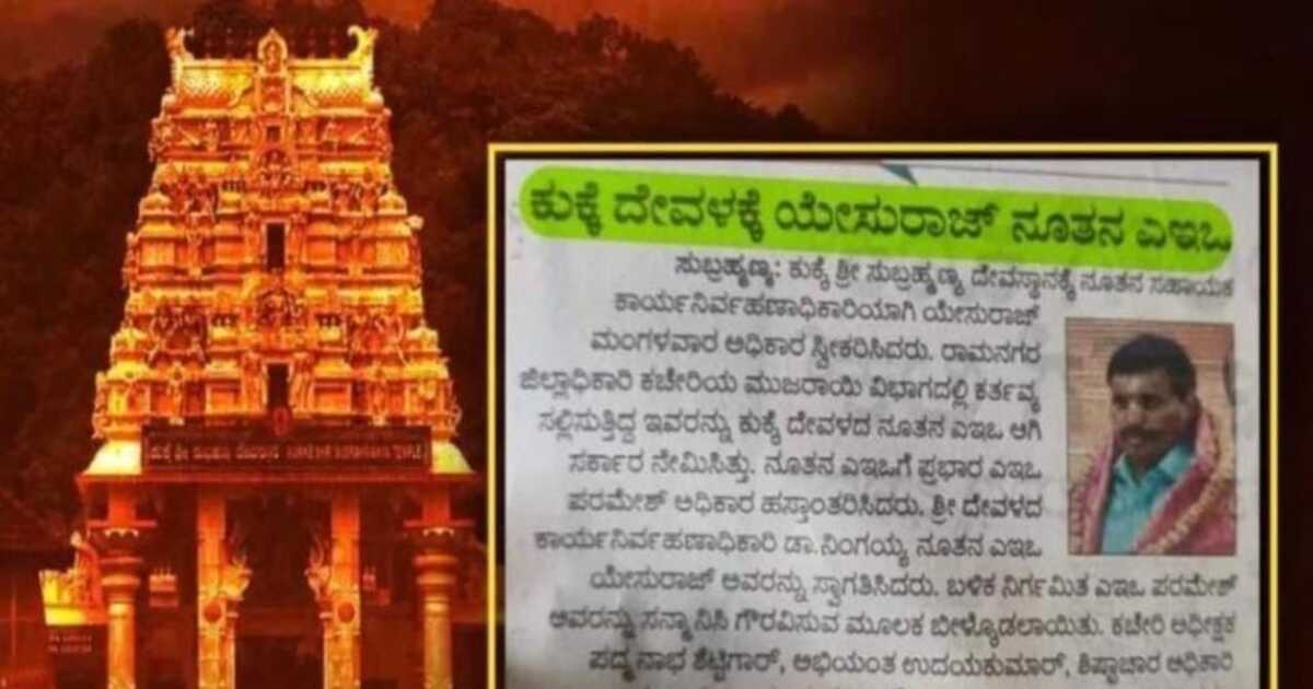 Kukke Subramanya: ದಕ್ಷಿಣ ಕನ್ನಡ ಜಿಲ್ಲೆಯ ಕುಕ್ಕೆ ಸುಬ್ರಹ್ಮಣ್ಯ ದೇವಸ್ಥಾನಕ್ಕೆ ಇತ್ತೀಚೆಗೆ ರಾಜ್ಯ ಸರಕಾರದಿಂದ ನೂತನ ಎಇಓ ನೇಮಕ ಮಾಡಲಾಗಿದ್ದು, ಇವರು ಕ್ರಿಶ್ಚಿಯನ್ ಸಮುದಾಯಕ್ಕೆ ಸೇರಿದವರು ಎಂಬ ಸುದ್ದಿ ಸಾಮಾಜಿಕ ಜಾಲತಾಣದಲ್ಲಿ ವೈರಲ್ ಆಗಿದೆ.