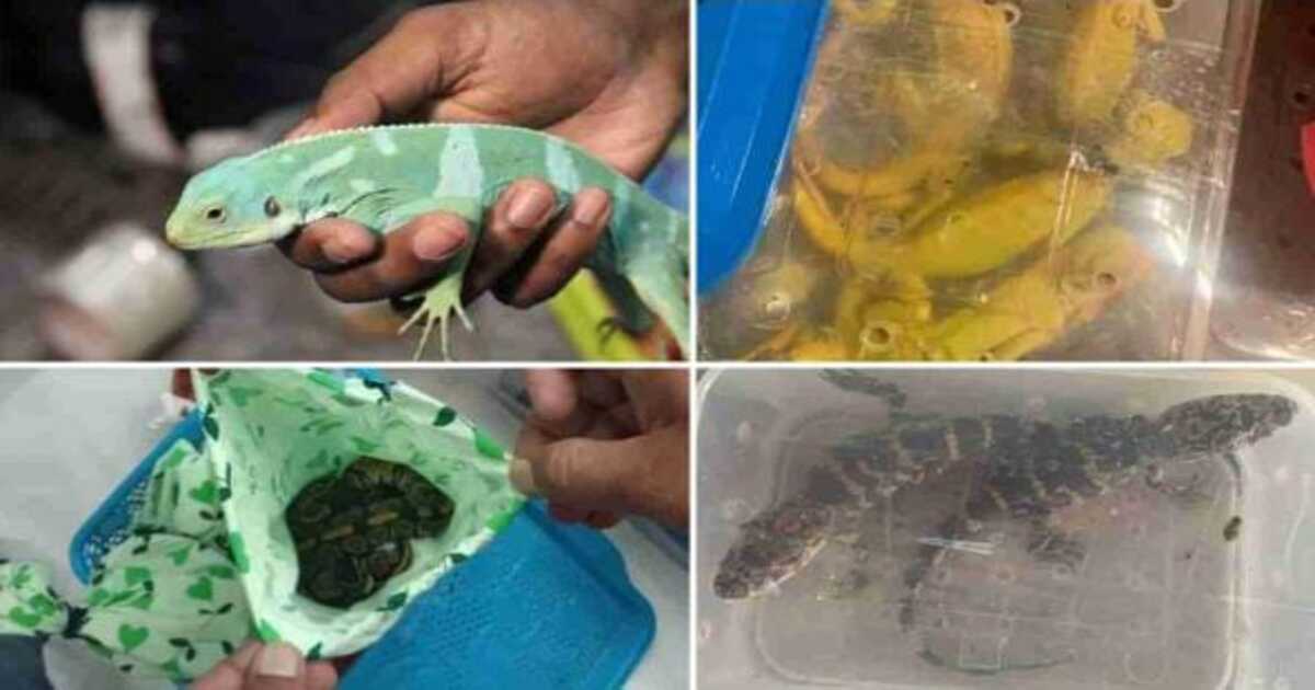 ಈತನ ಟ್ರಾಲಿ ಬ್ಯಾಗ್ನಲ್ಲಿ ಹೆಬ್ಬಾವು ಮರಿ, ಊಸರವಳ್ಳಿ, ಮೊಸಳೆ ಮರಿ, ಆಮೆಗಳು, ಮರಿ ಕಾಂಗರೂ ಸೇರಿ ಒಟ್ಟು 234 ವನ್ಯಜೀವಿಗಳು ಪತ್ತೆಯಾಗಿದೆ.