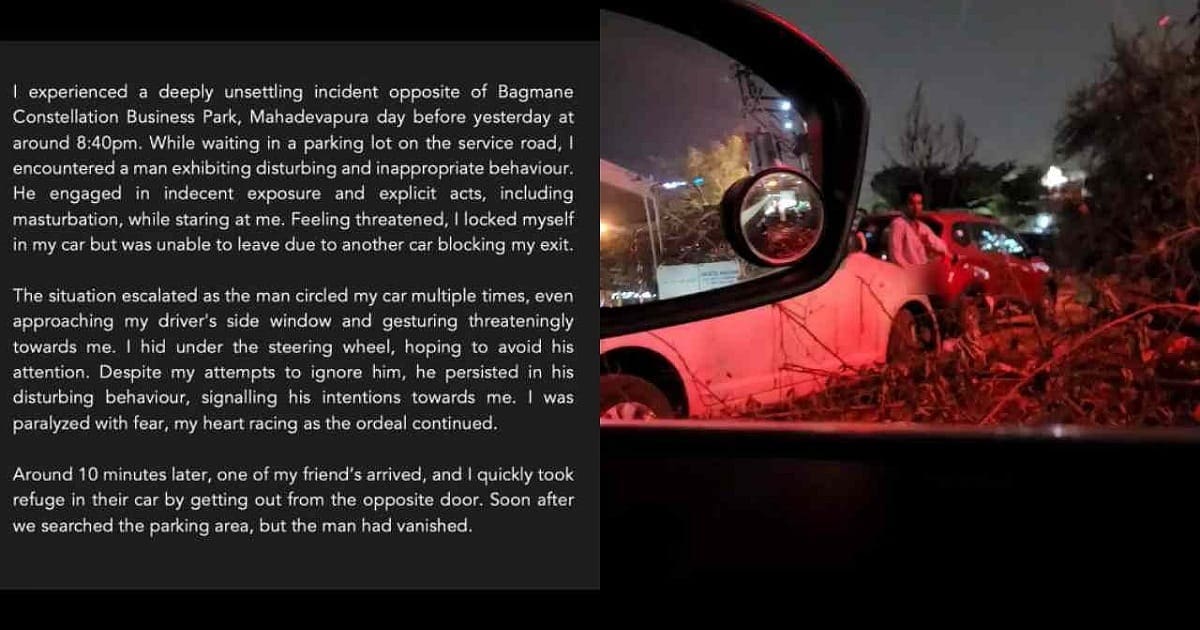 ಯುವತಿ ಆತನನ್ನು ನೋಡಿ ಹೆದರಿ ಕಾರಿನ ಸ್ಟಿಯರಿಂಗ್‌ ಕೆಳಗೆ ಅವಿತುಕೊಂಡಿದ್ದಳು. ನಂತರ ಆಕೆಯ ಸ್ನೇಹಿತರು ಬಂದ ನಂತರ ಯುವತಿ ಕಾರಿನಿಂದ ಕೆಳಗೆ ಇಳಿದಿದ್ದಾಳೆ. ಇದಾದ ನಂತರ ಯುವತಿ ತಾನು ಅನುಭವಿಸಿದ ಸಮಸ್ಯೆಯ ಬಗ್ಗೆ ಯುವತಿ ಸಾಮಾಜಿಕ ಜಾಲತಾಣ ಟ್ವಿಟ್ಟರ್‌ನಲ್ಲಿ ಬರೆದುಕೊಂಡಿದ್ದಾಳೆ. ಮಹಾದೇವಪುರ ಪೊಲೀಸ್‌ ಠಾಣೆಗೆ ಈ ಪ್ರಕರಣದ ಕುರಿತು ತನಿಖೆ ನಡೆಸುವಂತೆ ಸೂಚಿಸಲಾಗಿದೆ ಎಂದು ವರದಿಯಾಗಿದೆ.