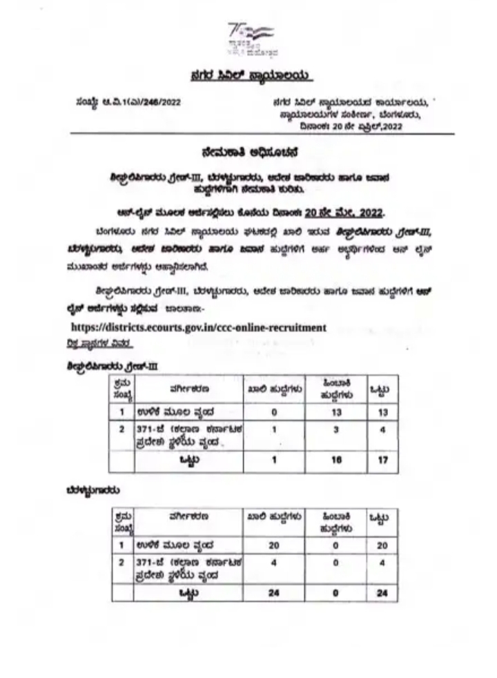 ಬೆಂಗಳೂರು ನಗರ ಸಿವಿಲ್ ನ್ಯಾಯಾಲಯ ಘಟಕದಲ್ಲಿ ಖಾಲಿ ಇರುವ ವಿವಿಧ ಹುದ್ದೆಗಳಿಗೆ ಅರ್ಜಿಯನ್ನು ಆಹ್ವಾನಿಸಲಾಗಿದೆ. ಆಸಕ್ತರು ಅರ್ಜಿಯನ್ನು ಸಲ್ಲಿಸಬಹುದು.