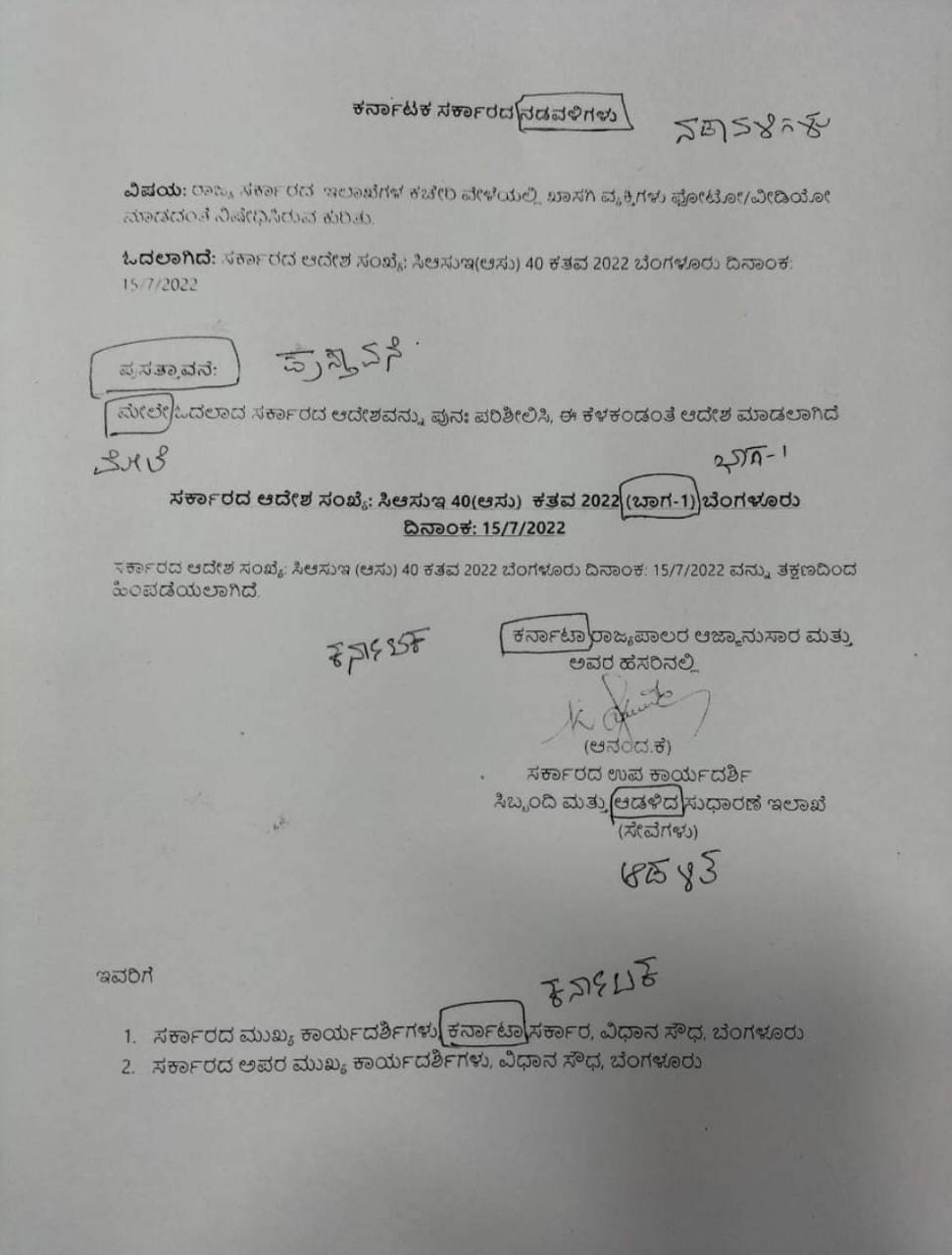 ಸರ್ಕಾರಿ ಕಚೇರಿಗಳಲ್ಲಿ ಮೊಬೈಲ್‌ನಲ್ಲಿ ಫೋಟೋ, ವೀಡಿಯೋಗೆ ನಿರ್ಬಂಧ ಆದೇಶವನ್ನು ಸದ್ಯ ರಾಜ್ಯ ಸರ್ಕಾರ ಹಿಂಪಡೆದುಕೊಂಡಿದೆ. ಈ  ಬೆನ್ನಲ್ಲೇ ಸರ್ಕಾರ ಹೊಸ ಸುತ್ತೋಲೆಯನ್ನು ಹೊರಡಿಸಿದೆ. ಸರ್ಕಾರಿ ಕಚೇರಿಯಲ್ಲಿ ಫೋಟೊ, ವೀಡಿಯೋ ಚಿತ್ರೀಕರಣ ಬಂದ್ ವಿಚಾರಕ್ಕೆ ಸಂಬಂಧಿಸಿ ಆದೇಶ ವಾಪಸ್ ತೆಗೆದುಕೊಳ್ಳುವಂತೆ ಮುಖ್ಯಮಂತ್ರಿ ಬಸವರಾಜ್ ಬೊಮ್ಮಾಯಿ ಅಧಿಕಾರಿಗಳನ್ನು ತೀವ್ರ ತರಾಟೆಗೆತ್ತಿಕೊಂಡಿದ್ದರು. ಈ ಹಿನ್ನೆಲೆಯಲ್ಲಿ ರಾತ್ರೋರಾತ್ರಿ ವಿಧಾನಸೌಧಕ್ಕೆ ಬಂದು ನಿದ್ದೆಗಣ್ಣಿನಲ್ಲಿ ಅಧಿಕಾರಿ ಆದೇಶ ವಾಪಸ್ ಸೂಚನೆಯನ್ನು ಟೈಪ್ ಮಾಡಿದ್ರಾ ಅಥವಾ ಅಧಿಕಾರಿಗೆ ಕನ್ನಡ ಟೈಪಿಂಗ್ ಸರಿಯಾಗಿ ಬರುತ್ತಿಲ್ಲವೇ ಎಂದು ಸಾಮಾಜಿಕ ಜಾಲತಾಣದಲ್ಲಿ ತೀವ್ರ ಚರ್ಚೆಯಾಗುತ್ತಿದೆ.