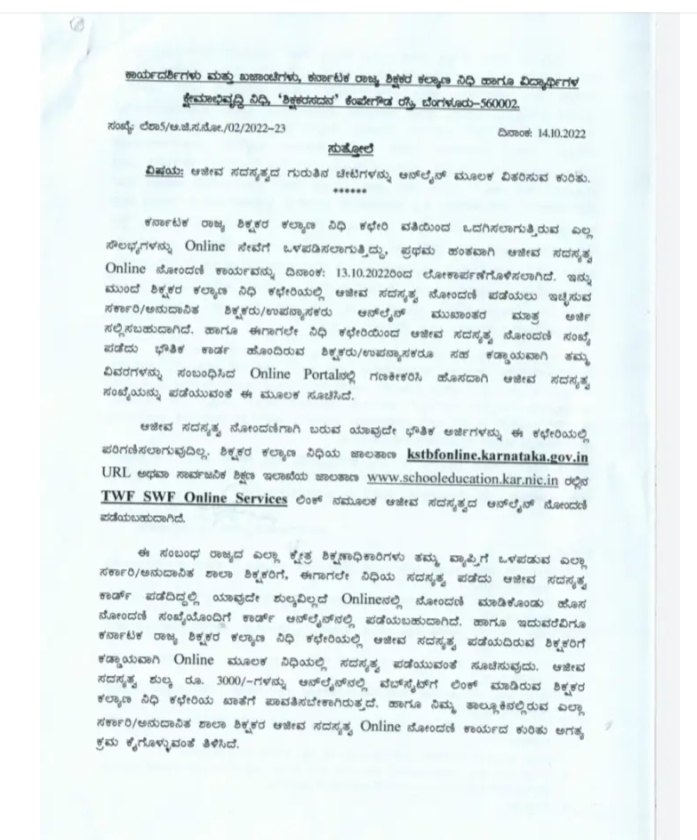 ಕರ್ನಾಟಕ ರಾಜ್ಯ ಶಿಕ್ಷಕರ ಕಲ್ಯಾಣ ನಿಧಿ ಕಚೇರಿಯಿಂದ ಒದಗಿಸಲಾಗುತ್ತಿರುವ ಎಲ್ಲಾ ಸೌಲಭ್ಯಗಳನ್ನು ಆನ್ ಲೈನ್ ಸೇವೆಗೆ ಒಳಪಡಿಸಲಾಗುತ್ತಿದ್ದು, ಪ್ರಥಮ ಹಂತವಾಗಿ ಅಜೀವ ಸದಸ್ಯತ್ವ ಆನ್ ಲೈನ್ ನೋಂದಣಿ ಕಾರ್ಯವನ್ನು ದಿನಾಂಕ 13-10-2022ರಿಂದ ಲೋಕಾರ್ಪಣೆಗೊಳಿಸಲಾಗಿದೆ ಎಂದು ತಿಳಿಸಿದೆ.