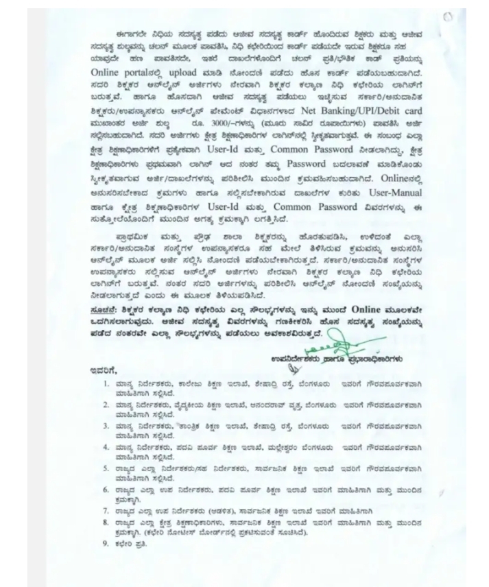 ಈಗ ಮುಂದುವರೆದು ಶಿಕ್ಷಕರ ಕಲ್ಯಾಣ ನಿಧಿ ಕಚೇರಿಯಲ್ಲಿ ಆಜೀವ ಸದಸ್ಯತ್ವ ನೋಂದಣಿ ಪಡೆಯುವ ಸೌಲಭ್ಯವನ್ನು ಆನ್ ಲೈನ್ ಮಾಡಿದೆ. ಹೀಗಾಗಿ ಇನ್ಮುಂದೆ ಶಿಕ್ಷಕರು, ಉಪನ್ಯಾಸಕರು ಸಹ ಕಡ್ಡಾಯವಾಗಿ ತಮ್ಮ ಅಜೀವ ಸದಸ್ಯತ್ವ ನೋಂದಣಿಯನ್ನು ಕಡ್ಡಾಯವಾಗಿ ಆನ್ ಲೈನ್ ಮೂಲಕ ಸಲ್ಲಿಸುವಂತೆ ತಿಳಿಸಲಾಗಿದೆ.