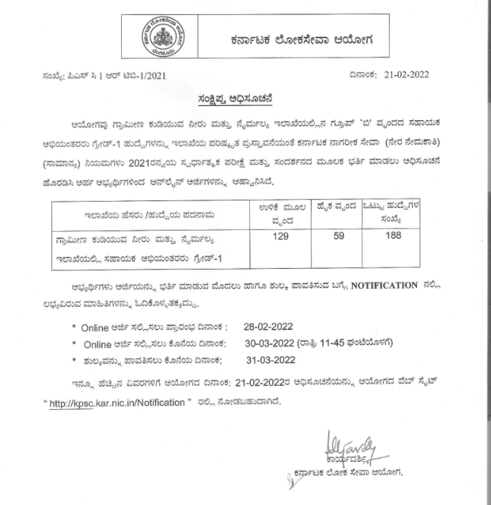 ಕರ್ನಾಟಕ ಲೋಕಸೇವಾ ಆಯೋಗವು ಗ್ರಾಮೀಣ ಕುಡಿಯುವ ನೀರು ಮತ್ತು ನೈರ್ಮಲ್ಯ ಇಲಾಖೆಯಲ್ಲಿನ ಗ್ರೂಪ್ ಬಿ ವೃಂದದ ಸಹಾಯಕ ಇಂಜಿನಿಯರ್ ಹುದ್ದೆಗಳ ಭರ್ತಿಗೆ ನೇಮಕ ಅಧಿಸೂಚನೆಯನ್ನು ಬಿಡುಗಡೆ ಮಾಡಿದೆ. ಈ ಹುದ್ದೆಗಳಿಗೆ ಆನ್ಲೈನ್ ಮೂಲಕ ಅರ್ಜಿ ಸಲ್ಲಿಸಲು ಅವಕಾಶವಿದೆ. ಅರ್ಜಿ ಸಲ್ಲಿಸಲು ಮಾರ್ಚ್ 30 ರವರೆಗೆ ಅವಕಾಶ ನೀಡಲಾಗಿದೆ.