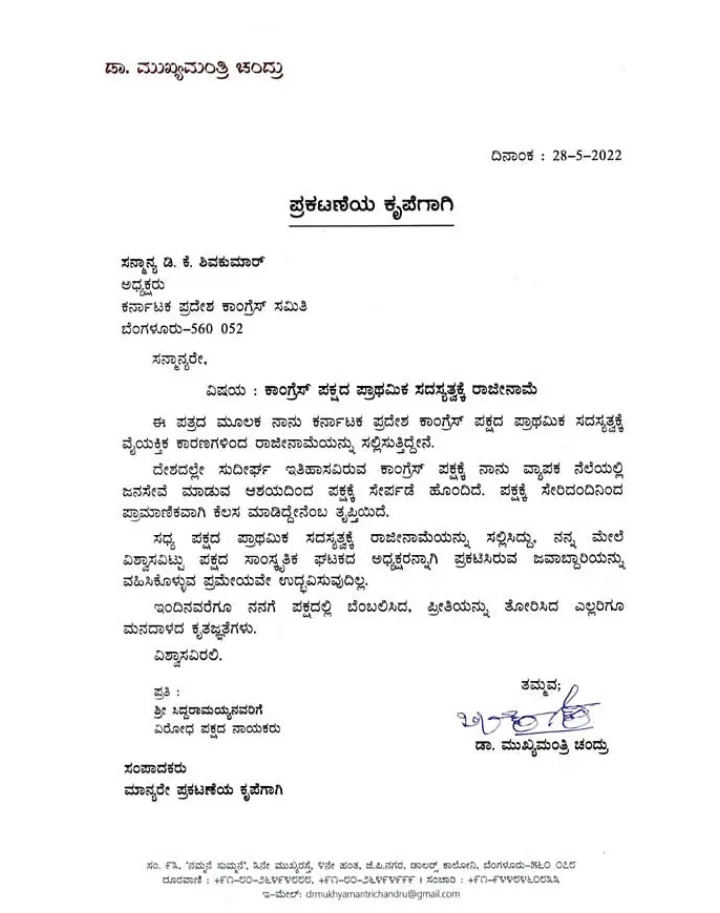 ರಾಜೀನಾಮೆ ನೀಡಿರುವ ಕುರಿತು ಮಾತನಾಡಿದ ಮುಖ್ಯಮಂತ್ರಿ ಚಂದ್ರು, ಜನಸೇವೆ ಮಾಡುವ ನಿಟ್ಟಿನಲ್ಲಿ ಕಾಂಗ್ರೆಸ್ ಪಕ್ಷಕ್ಕೆ ಸೇರ್ಪಡೆಯಾಗಿದ್ದೆ. ಪಕ್ಷದಲ್ಲಿದ್ದ ಪ್ರಾಮಾಣಿಕವಾಗಿ ಕೆಲಸ ಮಾಡಿದ್ದೇನೆ. ಇಲ್ಲಿವರೆಗೂ ನನಗೆ ಪಕ್ಷದಲ್ಲಿ ಬೆಂಬಲಿಸಿ, ಪ್ರೀತಿ ನೀಡಿದ ಎಲ್ಲರಿಗೂ ಧನ್ಯವಾದ ಎಂದು ತಿಳಿಸಿದ್ದಾರೆ.
