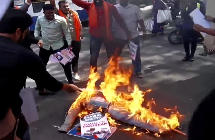 ಬೆಂಗಳೂರಿನಲ್ಲಿ ಮೈಸೂರು ಸರ್ಕಲ್ ನಲ್ಲಿ ಬಿಜೆಪಿ ಯುವ ಮೋರ್ಚಾ ವತಿಯಿಂದ ಪ್ರತಿಭಟನೆ ನಡೆಯಿತು.ಈ ವೇಳೆ ಪಾಕಿಸ್ತಾನದ ವರ್ತನೆ ವಿರುದ್ಧ ತೀವ್ರ ಆಕ್ರೋಶ ವ್ಯಕ್ತಪಡಿಸಿದ್ದಾರೆ. ಪಾಕಿಸ್ತಾನ ಈಗಾಗಲೇ ದಿವಾಳಿಯಾಗಿದೆ. ಅರಾಜಕತೆ ಸೃಷ್ಟಿಯಾಗಿದೆ. ಹೀಗಾಗಿ ಜಾಗತಿಕವಾಗಿ ಬೇರೆ ಕಡೆ ಗಮನ ಸೆಳೆಯಲು ಇಂತಹ ಹೇಳಿಕೆಯನ್ನು ನೀಡಲಾಗಿದೆ ಎಂದು ಬಿಜೆಪಿ ಕೆಂಡಾಮಂಡಲಗೊಂಡಿದ್ದಾರೆ