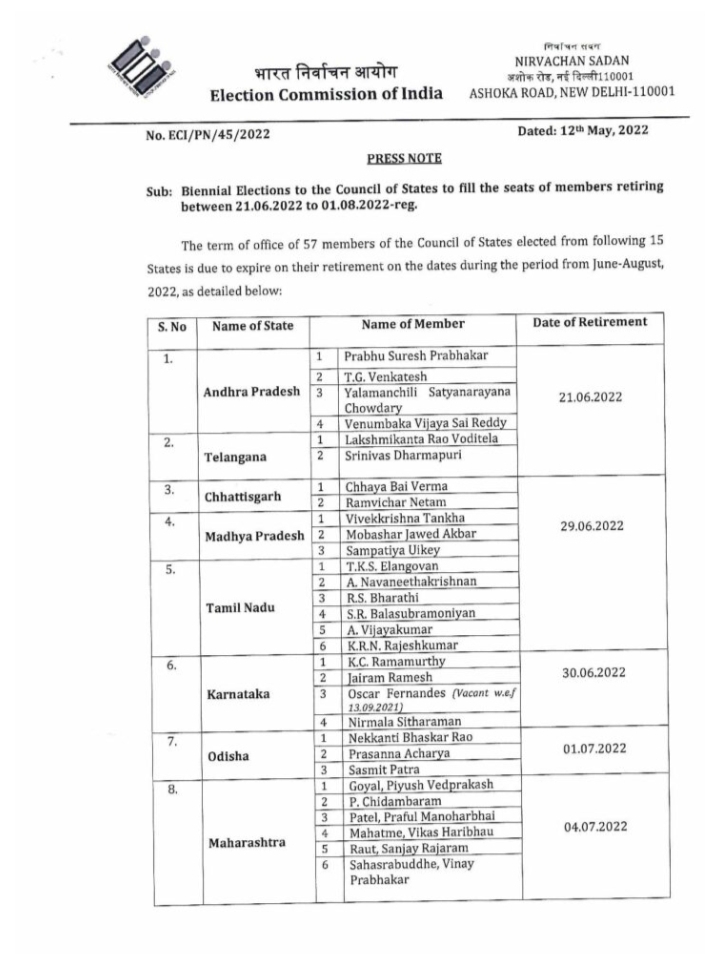 30-06-2022 ರಂದು ನಿವೃತ್ತಿಯಾಗಲಿರುವಂತ ಕರ್ನಾಟಕದಿಂದ ರಾಜ್ಯಸಭೆಗೆ ಆಯ್ಕೆಯಾಗಿದ್ದಂತ ನಾಲ್ಕು ಸ್ಥಾನಗಳು ಸೇರಿದಂತೆ ದೇಶದ 15 ರಾಜ್ಯಗಳ 57 ರಾಜ್ಯ ಸಭಾ ಸ್ಥಾನಗಳಿಗೆ ಚುನಾವಣಾ ಆಯೋಗದಿಂದ ಚುನಾವಣೆ ಘೋಷಣೆ ಮಾಡಲಾಗಿದೆ.