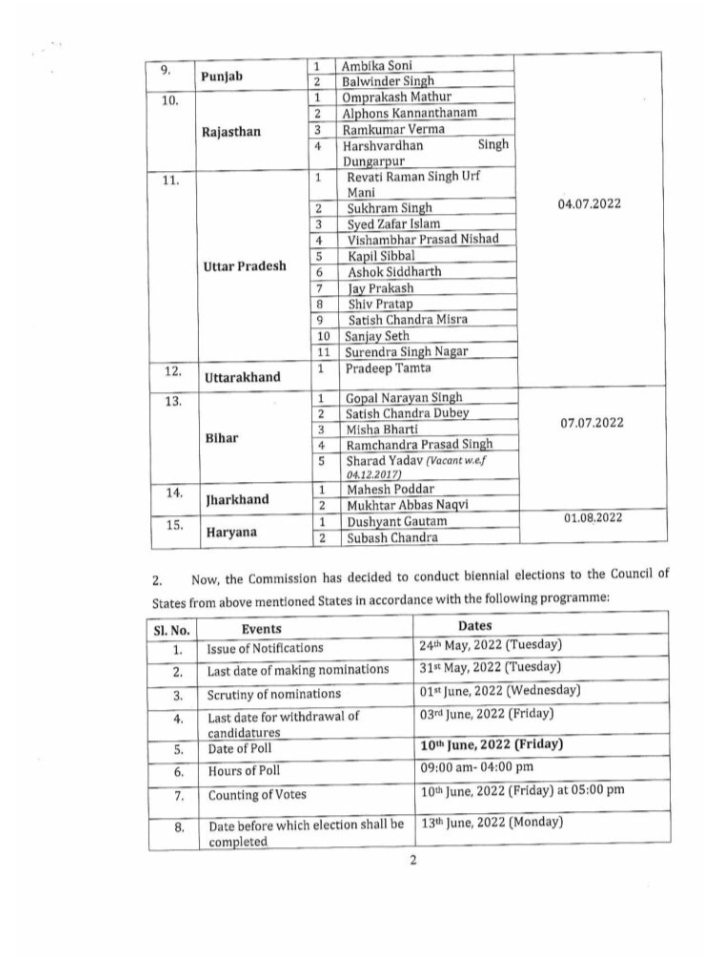 ಈ ಸಂಬಂಧ ಚುನಾವಣಾ ಆಯೋಗ ಆದೇಶ ಹೊರಡಿಸಿದ್ದು, ದಿನಾಂಕ 30-06-2022ರಂದು ಕರ್ನಾಟಕದಿಂದ ರಾಜ್ಯಸಭೆಗೆ ಆಯ್ಕೆಯಾಗಿದ್ದಂತ ಕೆಸಿ ರಾಮಮೂರ್ತಿ, ಜೈರಾಂ ರಮೇಶ್, ಆಸ್ಕರ್ ಫರ್ನಾಂಡಿಸ್, ನಿರ್ಮಲಾ ಸೀತಾರಾಮನ್ ಅವರು ನಿವೃತ್ತಿ ಹೊಂದಲಿದ್ದಾರೆ. ಈ ಸ್ಥಾನಗಳಿಗೆ ದಿನಾಂಕ 10-06-2022ರಂದು ಚುನಾವಣೆ ನಿಗದಿಗೊಳಿಸಲಾಗಿದೆ.