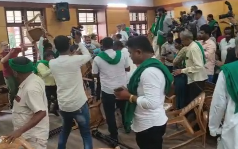 ಎರಡೂ ಬಣದ ರೈತರು ಗಾಂಧಿ ಭವನದಲ್ಲಿ ಕುರ್ಚಿ ತಗೊಂಡು ಒಬ್ಬರಿಗೊಬ್ಬರು ಹೊಡೆದಾಡಿಕೊಂಡಿದ್ದಾರೆ. ಈ ದೃಶ್ಯ ಸಾಮಾಜಿಕ ಜಾಲತಾಣದಲ್ಲಿ ವೈರಲ್ ಆಗುತ್ತಿವೆ.