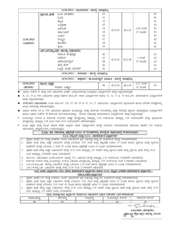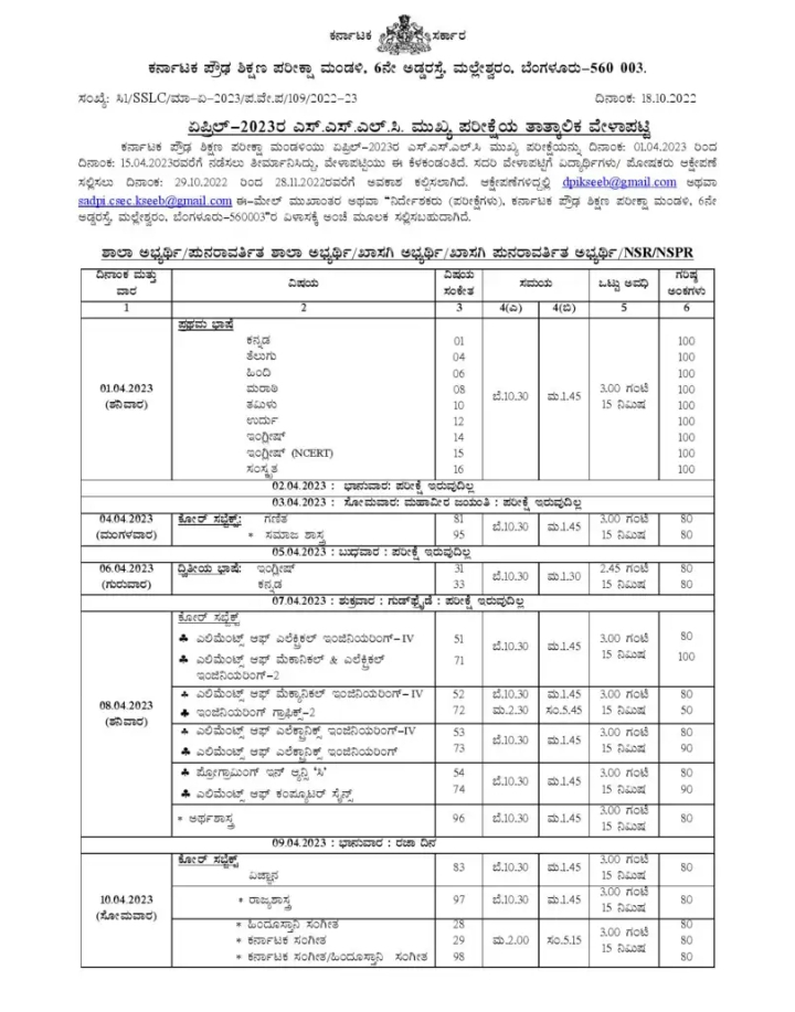 ಈ ಕುರಿತಂತೆ ಕರ್ನಾಟಕ ಪ್ರೌಢ ಶಿಕ್ಷಣ ಪರೀಕ್ಷಾ ಮಂಡಳಿಯಿಂದ (Karnataka Secondary Education Examination Board) ಮಾಹಿತಿ ಬಿಡುಗಡೆ ಮಾಡಲಾಗಿದ್ದು, ಏಪ್ರಿಲ್ 2023ರ ಎಸ್ ಎಸ್ ಎಲ್ ಸಿ ಮುಖ್ಯ ಪರೀಕ್ಷೆಯನ್ನು ದಿನಾಂಕ 01-04 2023ರಿಂದ ದಿನಾಂಕ 15-04-203ರವರೆಗೆ ನಡೆಸಲು ತೀರ್ಮಾನಿಸಲಾಗಿದೆ. ಈ ವೇಳಾಪಟ್ಟಿಗೆ ವಿದ್ಯಾರ್ಥಿಗಳು, ಪೋಷಕರು ಆಕ್ಷೇಪಣೆ ಸಲ್ಲಿಸಲು ದಿನಾಂಕ 29-10 2022 ರಿಂದ 28-11-2022ರವರೆಗೆ ಅವಕಾಶ ಕಲ್ಪಿಸಲಾಗಿದೆ ಎಂದಿದೆ.