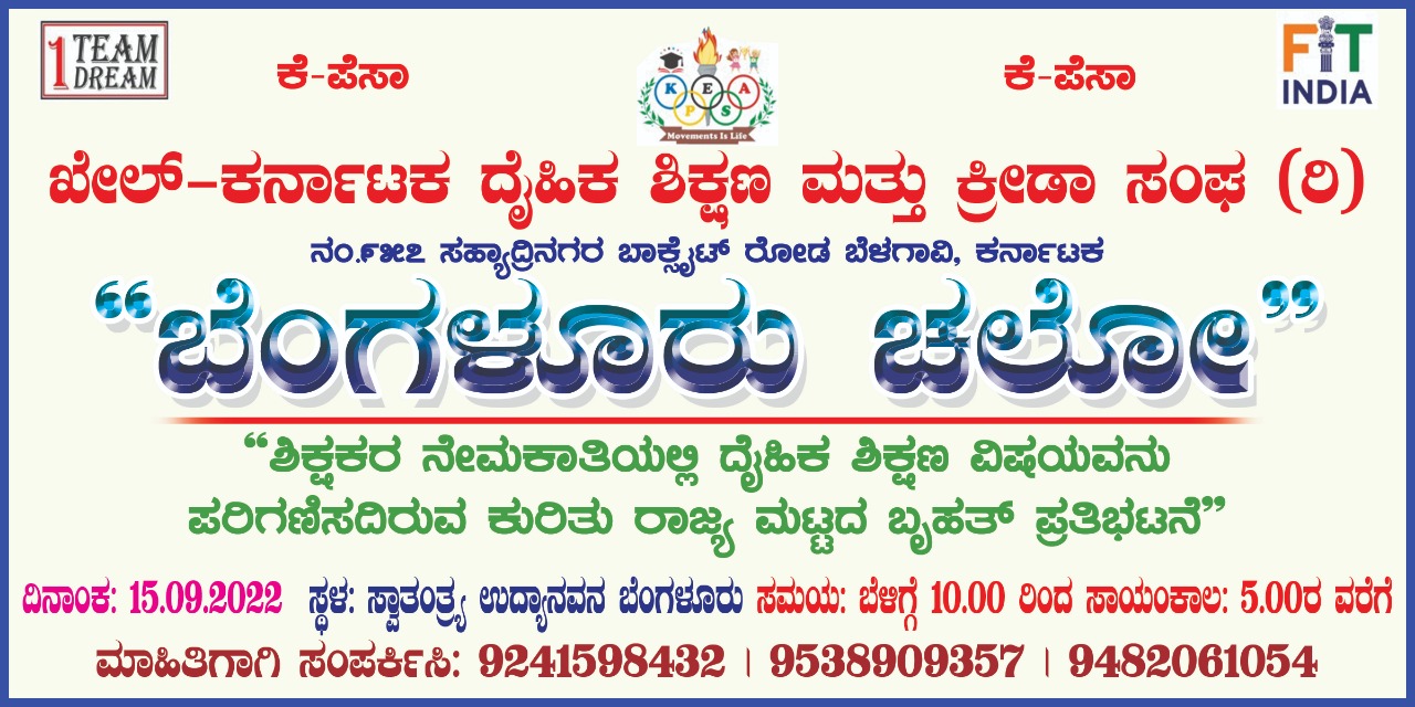ಖೇಲ್ ಕರ್ನಾಟಕ ದೈಹಿಕ ಶಿಕ್ಷಣ ಮತ್ತು ಕ್ರೀಡಾ ಸಂಘ(ರಿ)ವತಿಯಿಂದ ನಾಳೆ ಸೆ.15 ರಂದು ಮುಂಜಾನೆಯಿಂದ ಸಂಜೆಯವರೆಗೆ ಬೆಂಗಳೂರಿನ ಫ್ರೀಡಂ ಪಾರ್ಕ್ ನಲ್ಲಿ ಪ್ರತಿಭಟನೆ ಹಮ್ಮಿಕೊಳ್ಳಲಾಗಿದೆ ಎಂದು ಮೂಲಗಳಿಂದ ತಿಳಿದುಬಂದಿದೆ.