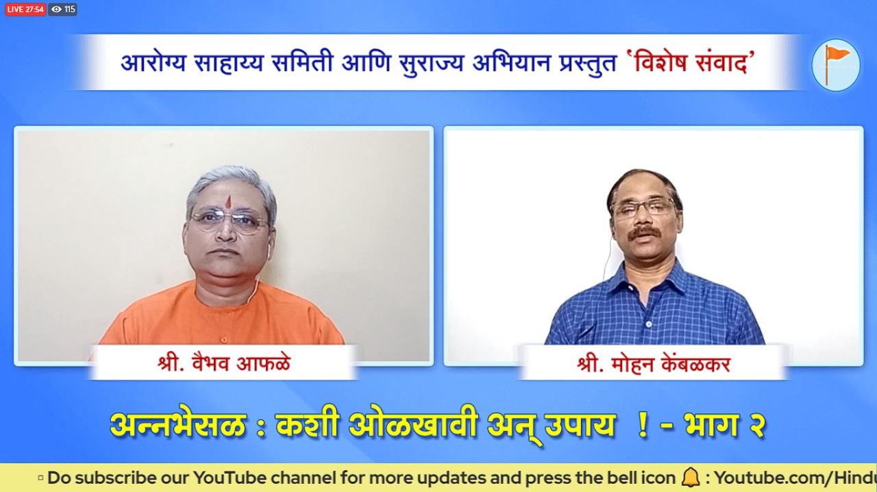 ಈ ಕಾರ್ಯಕ್ರಮದಲ್ಲಿ ಸತಾರಾ ಮತ್ತು ಕೊಲ್ಹಾಪುರದ ಜಿಲ್ಲಾ ಸಾರ್ವಜನಿಕ ಆರೋಗ್ಯ ಪ್ರಯೋಗಾಲಯದ ಕಿರಿಯ ವೈಜ್ಞಾನಿಕ ಅಧಿಕಾರಿ ಶ್ರೀ. ಸುನೀಲ ಪಾಖರೆ ಮತ್ತು ಅವರ ಸಹೋದ್ಯೋಗಿಗಳು ಹಾಲಿನ ಖೊವಾ, ಕೇಸರಿ, ದ್ವಿದಳ ಧಾನ್ಯ ಇತ್ಯಾದಿಗಳಲ್ಲಿ ಕಲಬೆರಕೆಯನ್ನು ಹೇಗೆ ಗುರುತಿಸಬಹುದು ಎಂಬುದನ್ನು ಪ್ರಾತ್ಯಕ್ಷಿಕೆಯೊಂದಿಗೆ ತೋರಿಸಿದರು. ಈ ಕಾರ್ಯಕ್ರಮವನ್ನು Hindujagruti.org ಈ ಜಾಲತಾಣ, ಸಮಿತಿಯ ‘HinduJagruti’ ಈ ‘ಯೂಟ್ಯೂಬ್ ಚಾನೆಲ್, ಹಿಂದೂ ಜನಜಾಗೃತಿ ಸಮಿತಿ, ಹಾಗೂ ಆರೋಗ್ಯ ಸಹಾಯ ಸಮಿತಿ ಮತ್ತು ಸುರಾಜ್ಯ ಅಭಿಯಾನದ ಟ್ವಿಟರ್ ಹ್ಯಾಂಡಲ್ಗಳಲ್ಲಿ ಪ್ರಸಾರ ಮಾಡಲಾಯಿತು. ಅದೇ ರೀತಿ ಅಕ್ಟೋಬರ್ 13 ರಂದು ಪ್ರಸಾರವಾದ ಈ ಕಾರ್ಯಕ್ರಮದ ಭಾಗ -1 ಅನ್ನು ನಾಗರಿಕರು ತಪ್ಪದೇ ನೋಡಬೇಕು ಮತ್ತು ‘ಕಲಬೆರಕೆ’ ಸಮಸ್ಯೆಯ ವಿರುದ್ಧ ಹೋರಾಡಲು ‘ಸುರಜ್ಯ ಅಭಿಯಾನ’ವನ್ನು ಸಂಪರ್ಕಿಸಬೇಕು ಎಂದು ಹಿಂದೂ ಜನಜಾಗೃತಿ ಸಮಿತಿಯ ಶ್ರೀ. ವೈಭವ ಆಫಳೆ ಇವರು ಕರೆ ನೀಡಿದರು.