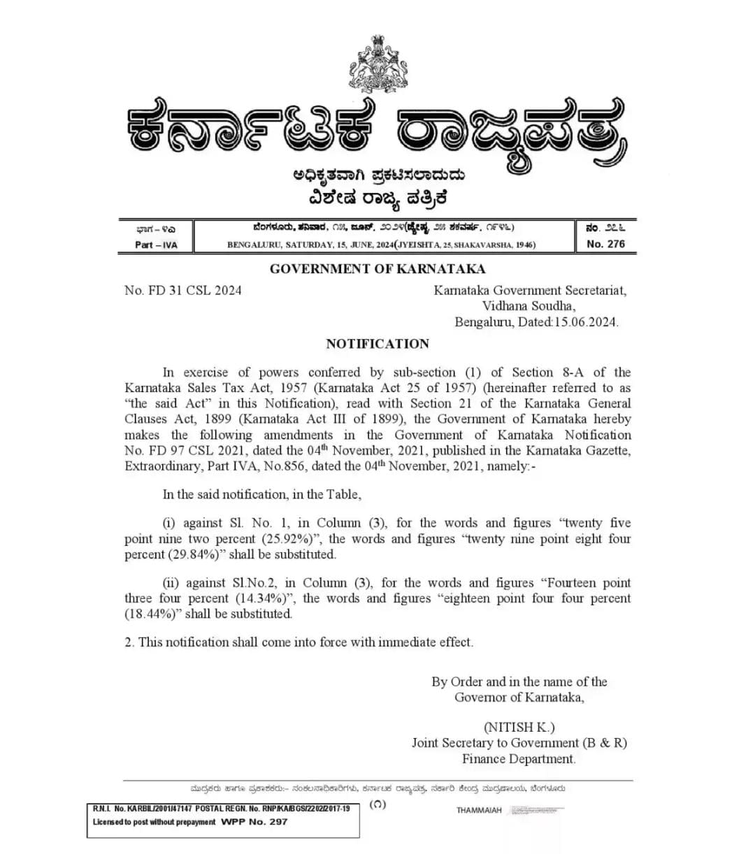 ಚಿಲ್ಲರೆ ಮಾರಾಟ ತೆರಿಗೆ ಶೇ 25.92 ರಷ್ಟಿತ್ತು. ಈಗ ಶೇ 3.9ರಷ್ಟು ಹೆಚ್ಚಳ ಮಾಡಲಾಗಿದ್ದು, ಶೇ 29.84 ಕ್ಕೆ ಏರಿಕೆ ಮಾಡಲಾಗಿದೆ. ಡಿಸೇಲ್ ಮೇಲಿನ ಚಿಲ್ಲರೆ ಮಾರಾಟ ತೆರಿಗೆ ಈ ಹಿಂದೆ ಶೇ 14.34 ರಷ್ಟಿತ್ತು. ಈಗ ಶೇ 4.1 ರಷ್ಟು ಹೆಚ್ಚಳ ಮಾಡಲಾಗಿದ್ದು, ಶೇ 18.44 ಕ್ಕೆ ಏರಿಕೆಯಾಗಲಿದೆ ಎಂಬುದಾಗಿ ತಿಳಿಸಿದೆ.