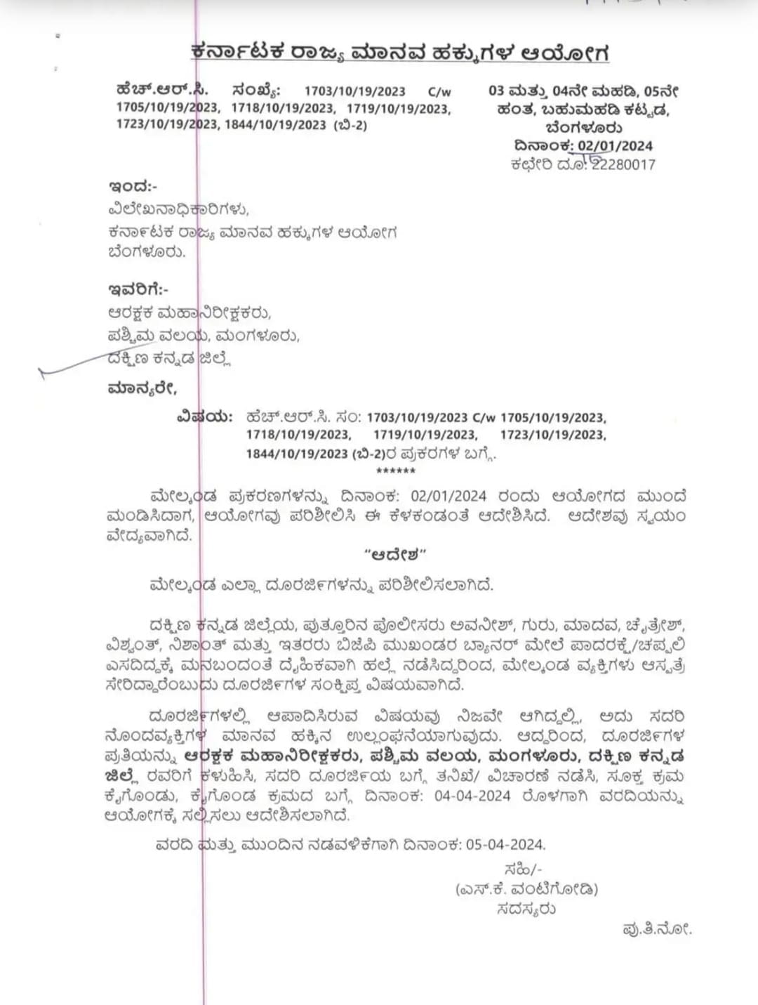 ಅವಿನಾಶ್ ನೀಡಿರುವ ದೂರು ಅರ್ಜಿಯಲ್ಲಿ ಆಪಾದಿಸಿರುವ ವಿಚಾರ ನಿಜವಾಗಿದಲ್ಲಿ ನೊಂದ ವ್ಯಕ್ತಿಗಳ ಮಾನವ ಹಕ್ಕಿನ ಉಲ್ಲಂಘನೆಯಾಗಿರುತ್ತದೆ ಎಂದು ತಿಳಿಸಿದೆ. ಈ ದೂರು ಅರ್ಜಿಯನ್ನು ತನಿಖೆ ನಡೆಸಿ ಸೂಕ್ತ ಕ್ರಮ ಕೈಗೊಳ್ಳಲು ಸೂಚನೆ ನೀಡಿದೆ. ಕೈಗೊಂಡ ಕ್ರಮದ ಬಗ್ಗೆ 2024ರ ಎ.4 ರೊಳಗೆ ವರದಿಯನ್ನು ಆಯೋಗಕ್ಕೆ ಸಲ್ಲಿಸಲು ಐಜಿಪಿಗೆ ಆದೇಶ ಹೊರಡಿಸಲಾಗಿದೆ.