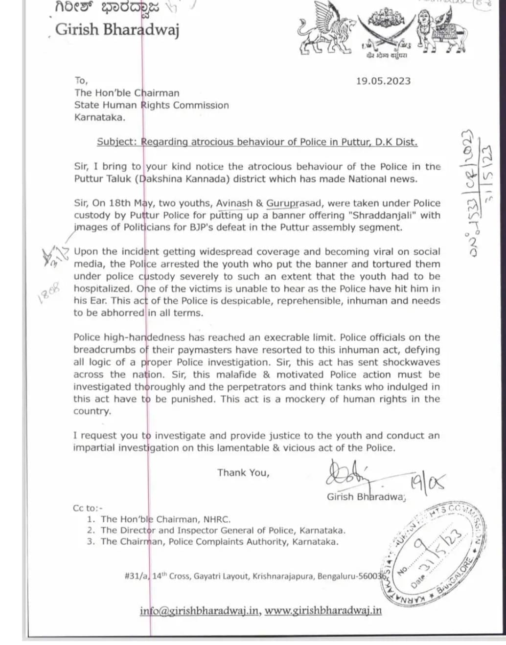 ಈ ಪ್ರಕರಣದಲ್ಲಿ ಹಲ್ಲೆಗೊಳಗಾದ ಅವಿನಾಶ್ ನೀಡಿದ ದೂರಿನ ಅನುಸಾರ, ಪುತ್ತೂರು ನಗರ ಠಾಣೆಯಲ್ಲಿ ಪುತ್ತೂರು ಡಿವೈಎಸ್ಪಿ ವೀರಯ್ಯ ಹಿರೇಮರ್, ಪುತ್ತೂರು ಗ್ರಾಮಾಂತರ ಪಿಎಸ್ಐ ಶ್ರೀನಾಥ್, ಪಿಸಿ ಹರ್ಷಿತ್ ಅವರ ಮೇಲೆ ಪ್ರಕರಣ ದಾಖಲಾಗಿತ್ತು. ಇದಾದ ಬಳಿಕ, ಹಿಂದೂ ಮುಖಂಡ ಹಾಗೂ ವಕೀಲ ಗಿರೀಶ್ ಭಾರದ್ವಜ್ ಈ ಘಟನೆಯ ಕುರಿತು, ರಾಜ್ಯ ಮಾನವ ಹಕ್ಕು ಆಯೋಗಕ್ಕೆ ದೂರು ನೀಡಿದ್ದರು. ಇದೀಗ, ಆಯೋಗದ ಅಧಿಕಾರಿಗಳು ಈ ಘಟನೆಯನ್ನು ತನಿಖೆ ನಡೆಸಿದ್ದು, ಪಶ್ಚಿಮ ವಲಯ ಐಜಿಪಿ ಗೆ ಪತ್ರ ಬರೆದಿದೆ ಎಂದು ತಿಳಿದುಬಂದಿದೆ.