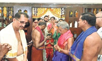 Actress Shilpa Shetty: ಬಾಲಿವುಡ್ ನಟಿ ಶಿಲ್ಪಾ ಶೆಟ್ಟಿ ಹಾಗೂ ಪತಿ ರಾಜ್ ಕುಂದ್ರ ದಂಪತಿ ಪಡುಬಿದ್ರಿಯ ಶ್ರೀ ಖಡ್ಗೇಶ್ವರೀ ಬ್ರಹ್ಮಸ್ಥಾನದಲ್ಲಿ ಶುಕ್ರವಾರ ರಾತ್ರಿ ನಡೆದಿದ್ದ ಢಕ್ಕೆಬಲಿ ಸೇವೆಯ ಸಮಯದಲ್ಲಿ ಸುಮಾರು ನಾಲ್ಕು ಗಂಟೆ ಕಾಲ ಪದ್ಮಾಸನಸ್ಥರಾಗಿ ತಂಬಿಲ ಹಾಗೂ ಮಂಡಲ ಸೇವೆಗಳನ್ನು ಭಕ್ತಿಭಾವದಿಂದ ವೀಕ್ಷಿಸಿದರು.
