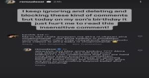 ಪವನ್ ಅಭಿಮಾನಿಗಳ ಪೈಕಿ ಒಬ್ಬ ಮಾಡಿರುವ ಕಾಮೆಂಟ್ ನಟಿಯ ಮನಸ್ಸಿಗೆ ಘಾಸಿಗೊಳಿಸಿದ್ದು,“ ಮೇಡಂ ಇದು ಅತಿಯಾಯಿತು. ಒಂದು ಬಾರಿಯಾದರೂ ಅಕಿರ ನಂದನ್ ಅವರನ್ನು ನಮಗೆ ತೋರಿಸಿ, ಪವನ್ ಅಣ್ಣ ಅವರ ಮಗನನ್ನು ನೋಡುವ ಆಸೆ ನಮಗೂ ಇದೆ. ಅಕಿರ ಅವರ ವಿಡಿಯೋವನ್ನು ಪೋಸ್ಟ್ ಮಾಡುತ್ತಿರಿ” ಎಂದು ತೆಲುಗಿನಲ್ಲಿ ಪವನ್ ಕಲ್ಯಾಣ್ ಅಭಿಮಾನಿಯೊಬ್ಬ ಕಾಮೆಂಟ್ ಮಾಡಿದ್ದಾರೆ.