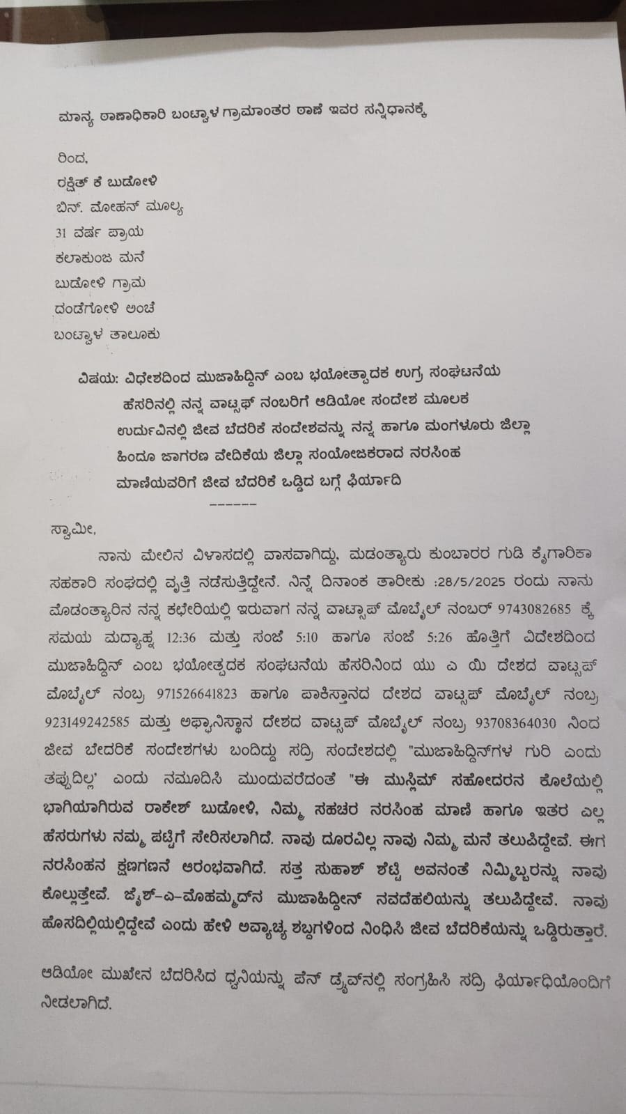 ಬಂಟ್ವಾಳ ತಾಲೂಕಿನ ಬುಡೋಳಿಯ ದಂಡೆಗೋಳಿ ನಿವಾಸಿ, ಮಡಂತ್ಯಾರಿನ ಕುಂಬಾರರ ಗುಡಿ ಕೈಗಾರಿಕಾ ಸಹಕಾರಿ ಸಂಘದಲ್ಲಿ ಉದ್ಯೋಗದಲ್ಲಿದ್ದು ಬಜರಂಗದಳದ ತಾಲೂಕು ಕಾರ್ಯನಿರ್ವಾಹಕರಾಗಿರುವ ರಕ್ಷಿತ್ ಎಂಬವರ ಮೊಬೈಲಿಗೆ ಕಳೆದ ದಿನಾಂಕ 28ರ ಮಧ್ಯಾಹ್ನ 12:30 ಮತ್ತು ಸಂಜೆ 5.10 ಹಾಗೂ 5. 26ಕ್ಕೆ ಸರಣಿಯಾಗಿ ಸೌದಿ ಅರೇಬಿಯಾ ಪಾಕಿಸ್ತಾನ ಹಾಗೂ ಆಫ್ಘಾನಿಸ್ತಾನಗಳ ಮೊಬೈಲ್ ನಂಬರ್ ಗಳಿಂದ ಜೈಷೆ ಮುಜಾಹಿದ್ದೀನ್ ಸಂಘಟನೆ ಹೆಸರಲ್ಲಿ ಭಜರಂಗದಳದ ಜಿಲ್ಲಾ ಸಂಯೋಜಕ ನರಸಿಂಹ ಮಾಣಿ ಹಾಗೂ ತಾಲೂಕು ಕಾರ್ಯನಿರ್ವಾಹಕ ರಕ್ಷಿತ್ ಬುಡೋಳಿಯವರನ್ನು ಕೊಲೆಗೆಯ್ಯುವುದಾಗಿ ಬೆದರಿಕೆಯೊಡ್ಡಿ ವಾಟ್ಸಾಪ್ ಸಂದೇಶಗಳು ಬಂದಿರುವುದಾಗಿ ರಕ್ಷಿತ್ ಬುಡೋಳಿ ಬಂಟ್ವಾಳ ಗ್ರಾಮಾಂತರ ಪೋಲಿಸ್ ಠಾಣೆಗೆ ನೀಡಿದ ದೂರಿನಲ್ಲಿ ತಿಳಿಸಿದ್ದಾರೆ.