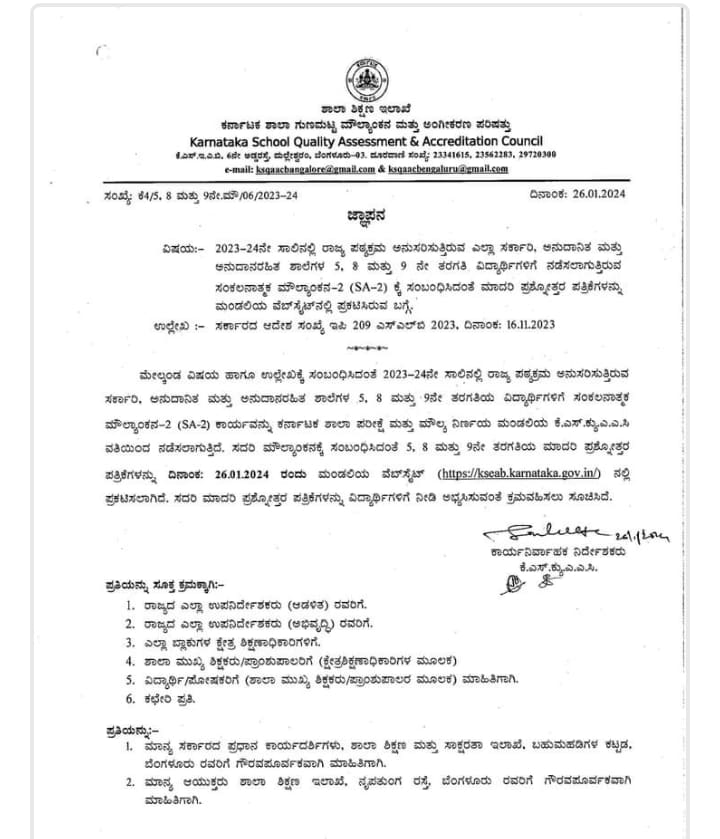 Model Question Paper: ಎಲ್ಲ ಸರಕಾರಿ ಅನುದಾನಿತ ಮತ್ತು ಅನುದಾನ ರಹಿತ ಶಾಲೆಗಳ 2023-24 ನೇ ಸಾಲಿನಲ್ಲಿ 5,8 ಮತ್ತು 9 ನೇ ತರಗತಿ ವಿದ್ಯಾರ್ಥಿಗಳಿಗೆ ನಡೆಸಲಾಗುತ್ತಿರುವ ಸಂಕಲನಾತ್ಮಕ ಮೌಲ್ಯಾಂಕನ-2(SA-2) ಕ್ಕೆ ಸಂಬಂಧಪಟ್ಟಂತೆ ಮಾದರಿ ಪ್ರಶ್ನೋತ್ತರ ಪತ್ರಿಕಗಳನ್ನು ಮಂಡಲಿಯ ವೆಬ್ಸೈನ್ನಲ್ಲಿ ಪ್ರಕಟ ಮಾಡಲಾಗಿದೆ.