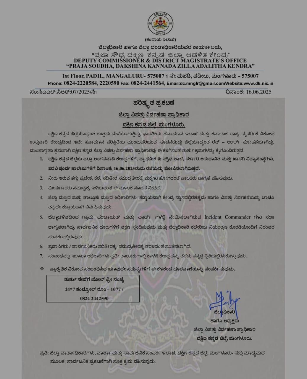 ಇಂದು (ಜೂನ್ 16) ರಜೆ ಘೋಷಣೆ ಮಾಡಿ ಜಿಲ್ಲಾಧಿಕಾರಿ ಮುಲ್ಲೈ ಮುಗಿಲನ್ ಆದೇಶ ನೀಡಿದ್ದಾರೆ.