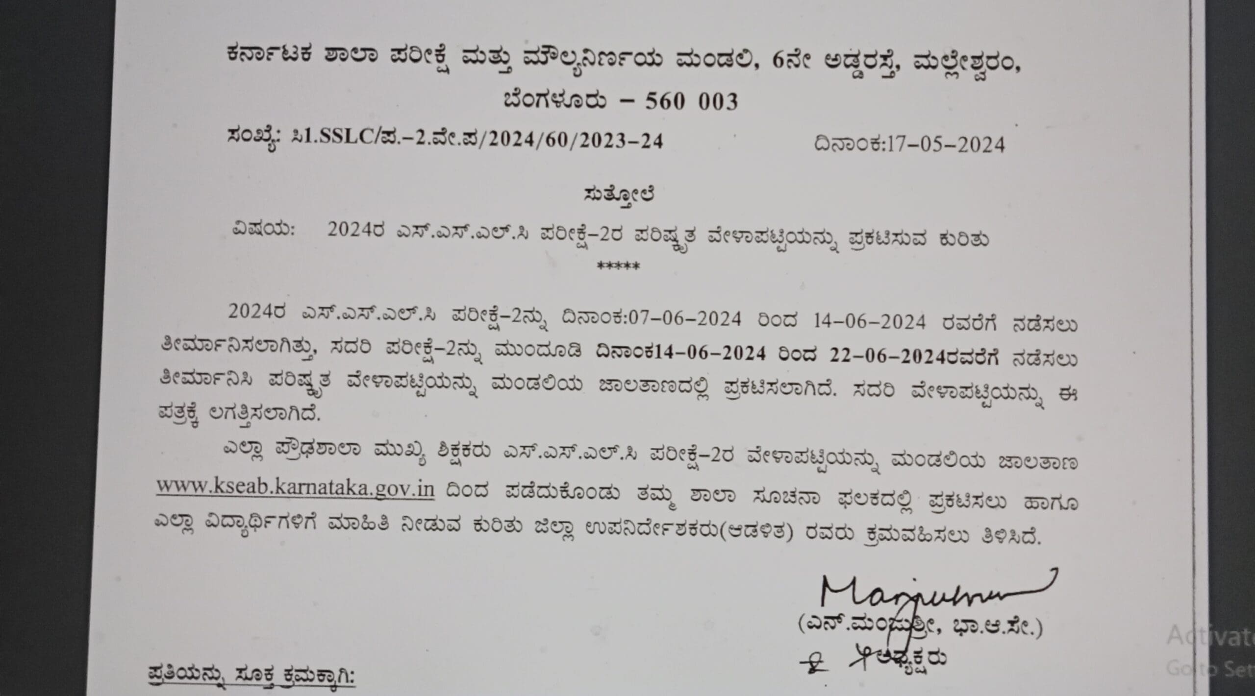 ಎಲ್ಲಾ ಪ್ರೌಢಶಾಲಾ ಮುಖ್ಯ ಶಿಕ್ಷಕರು ಎಸ್ಎಸ್ಎಲ್ಸಿ ಪರೀಕ್ಷೆ-2 ರ ವೇಳಾಪಟ್ಟಿಯನ್ನು ಮಂಡಲಿಯ ಜಾಲತಾಣ www.kseab.karnataka.gov.in ದಿಂದ ಪಡೆದು ತಮ್ಮ ಶಾಲಾ ಸೂಚನಾ ಫಲಕದಲ್ಲಿ ಪ್ರಕಟಿಸಲು ಹಾಗೂ ಎಲ್ಲಾ ವಿದ್ಯಾರ್ಥಿಗಳಿಗೆ ಮಾಹಿತಿ ನೀಡುವ ಕುರಿತು ಜಿಲ್ಲಾ ಉಪನಿರ್ದೇಶಕರು (ಆಡಳಿತ) ರವರು ಕ್ರಮವಹಿಸಲು ತಿಳಿಸಿದೆ.