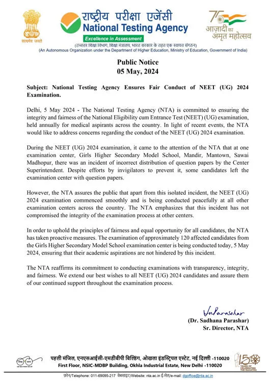ಈ ಬಗ್ಗೆ ಹೇಳಿಕೆ ನೀಡಿದ ಎನ್ಟಿಎ ನ್ಯಾಷನಲ್ ಟ್ರಸ್ಟಿಗೆ ಏಜೆನ್ಸಿ ನೀಟ್ ಪ್ರಶ್ನೆ ಪತ್ರಿಕೆಗಳು ಲೀಕ್ ಆಗಿಲ್ಲ ಎಂದಿದೆ.”ಪೇಪರ್ ಸೋರಿಕೆ” ಎಂಬುದು ಸಂಪೂರ್ಣವಾಗಿ ಸುಳ್ಳು. ರಾಜಸ್ಥಾನದ ಗರ್ಲ್ಸ್ ಹೈಯರ್ ಸೆಕೆಂಡರಿ ಆದರ್ಶ ವಿದ್ಯಾ ಮಂದಿರದಲ್ಲಿ ನಡೆದ ಘಟನೆಯಲ್ಲಿ, ವಿದ್ಯಾರ್ಥಿಗಳಿಗೆ ತಪ್ಪಾಗಿ ಇಂಗ್ಲಿಷ್ ಮಾಧ್ಯಮದ ಪ್ರಶ್ನೆ ಪತ್ರಿಕೆಯನ್ನು ನೀಡಲಾಯಿತು. ಮತ್ತು ಇನ್ವಿಜಿಲೇಟರ್ ತನ್ನ ತಪ್ಪನ್ನು ಸರಿಪಡಿಸುವ ಹೊತ್ತಿಗೆ ವಿದ್ಯಾರ್ಥಿಗಳು ಬಲವಂತವಾಗಿ ಪ್ರಶ್ನೆ ಪತ್ರಿಕೆಯೊಂದಿಗೆ ಪರೀಕ್ಷಾ ಹಾಲ್ನಿಂದ ಹೊರಬಿದ್ದಿದ್ದಾರೆ ಎಂದು ಎನ್ಟಿಎ ಹಿರಿಯ ಅಧಿಕಾರಿಯೊಬ್ಬರು ತಿಳಿಸಿದ್ದಾರೆ.