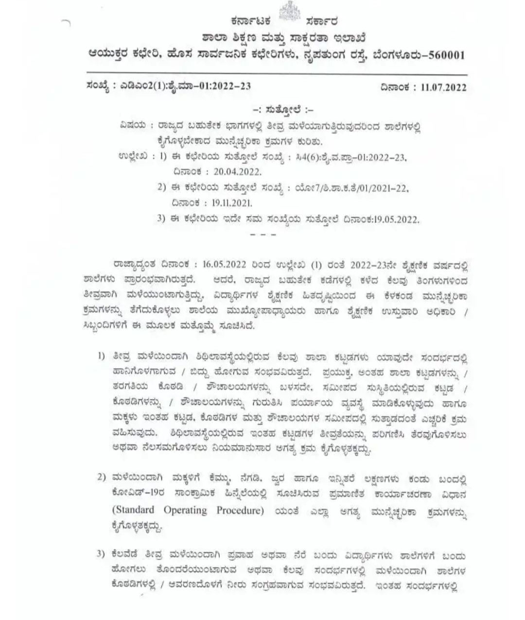 ಬೆಂಗಳೂರು : ರಾಜ್ಯಾದ್ಯಂತ ತೀವ್ರ ಮಳೆಯಾಗುತ್ತಿದ್ದು, ವಿದ್ಯಾರ್ಥಿಗಳನ್ನು ಶಾಲೆಗೆ ಕಳುಹಿಸಲು ಪೋಷಕರು ಹಿಂದೇಟುಹಾಕುತ್ತಿದ್ದಾರೆ. ಹೀಗಾಗಿ ಮಕ್ಕಳ ಹಿತದೃಷ್ಟಿಯಿಂದ ಶಿಕ್ಷಣ ಇಲಾಖೆ ಮುಂಜಾಗ್ರತಾ ಕ್ರಮಗಳನ್ನು ಹೊರಡಿಸಿದೆ.