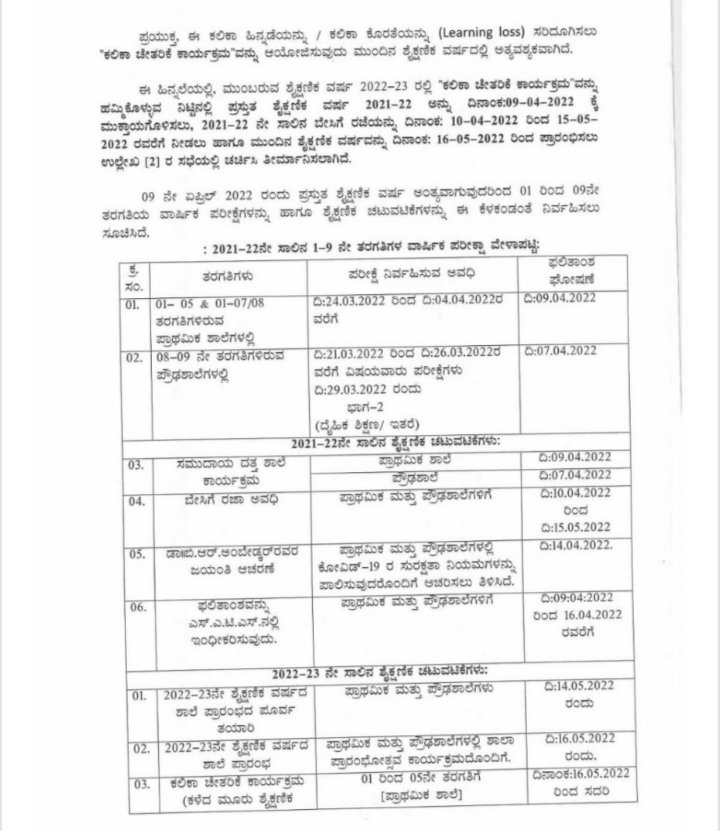 ಮುಂಬರುವ ಶೈಕ್ಷಣಿಕ ವರ್ಷ 2022-23 ಕಲಿಕಾ ಚೇತರಿಕೆ ಕಾರ್ಯಕ್ರಮವನ್ನು ಹಮ್ಮಿಕೊಳ್ಳುವ ನಿಟ್ಟಿನಲ್ಲಿ ಪ್ರಸ್ತುತ ಶೈಕ್ಷಣಿಕ ವರ್ಷ 2021-22 ಅನ್ನು ದಿನಾಂಕ 09-04-2022 ಕ್ಕೆ ಮುಕ್ತಾಯಗೊಳಿಸಲಾಗುವುದು. 2021-22 ನೇ ಸಾಲಿನ ಬೇಸಿಗೆ ರಜೆಯನ್ನು ದಿನಾಂಕ : 10-04-2022 ರಿಂದ 15-05-2022 ನೀಡಲಾಗಿದೆ.