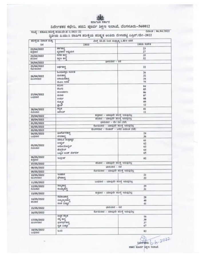 2021-22ನೇ ಸಾಲಿನ ದ್ವಿತೀಯ ಪಿಯುಸಿ ವಾರ್ಷಿಕ ಪರೀಕ್ಷೆಯ ಅಂತಿಮ ವೇಳಾಪಟ್ಟಿಯನ್ನು ಮತ್ತೆ ಪರಿಷ್ಕರಿಸಲಾಗಿದೆ. ದಿನಾಂಕ 24-04-2022 ರಿಂದ 18-05-2022ರವರೆಗೆ ನಿಗದಿಯಾಗಿದ್ದ ಪರೀಕ್ಷಾ ವೇಳಾಪಟ್ಟಿಯಲ್ಲಿ ಕೆಲವು ತಾಂತ್ರಿಕ ಕಾರಣಗಳಿಂದ ಅಲ್ಪ ಬದಲಾವಣೆ ಮಾಡಿ, ಪರಿಷ್ಕೃತ ವೇಳಾಪಟ್ಟಿಯನ್ನು ಪ್ರಕಟಿಸಲಾಗಿದೆ.