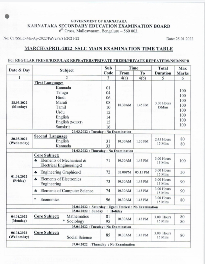 ಹೀಗಿದೆ ಎಸ್ ಎಸ್ ಎಲ್ ಸಿ ಮುಖ್ಯ ಪರೀಕ್ಷೆಯ ವಿಷಯವಾರು ವೇಳಾಪಟ್ಟಿ :