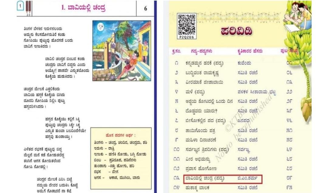 ಕವಿ ಬಿ.ಎಂ ಶರ್ಮಾ ಎಂಬುವರು ಬರೆದಿರುವಂತ ‘ಬಾವಿಯಲ್ಲಿ ಚಂದ್ರ’ ಪದ್ಯವನ್ನು 3ನೇ ತರಗತಿ ಹಾಗೂ 4ನೇ ತರಗತಿಯ ಕನ್ನಡ ಪುಸ್ತಕದಲ್ಲಿ ಮುದ್ರಣ ಮಾಡಲಾಗಿದ್ದು, ಈ ಮೂಲಕ ಪಠ್ಯಪುಸ್ತಕ ಪರಿಷ್ಕರಣೆ ಸಮಿತಿಯ ಮತ್ತೊಂದು ಎಡವಟ್ಟು ಬಯಲಾಗಿದೆ.