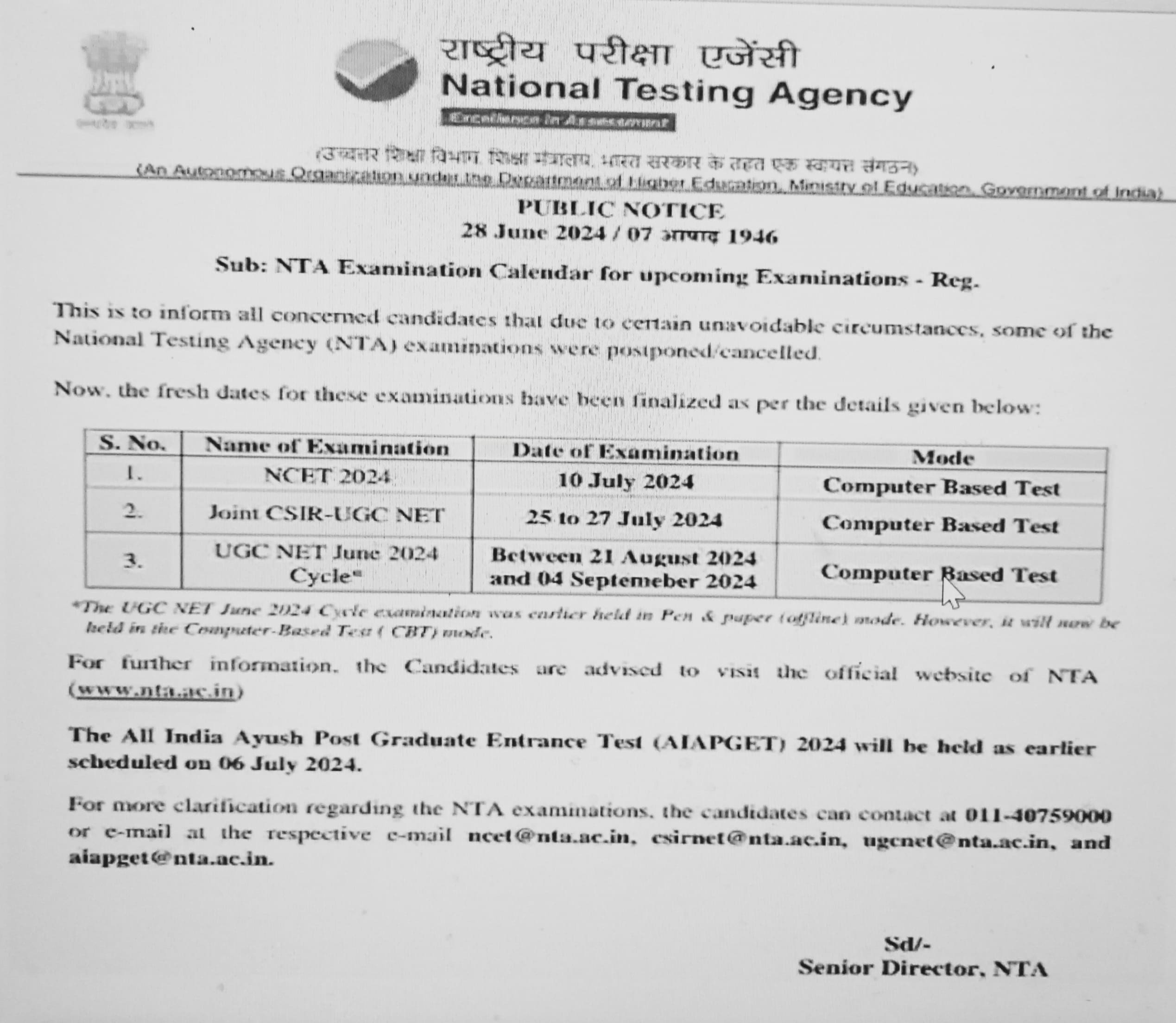 UGC NET ಪರೀಕ್ಷೆಯಲ್ಲಿನ ಅಕ್ರಮಗಳಿಂದಾಗಿ, NTA ಈ ಪರೀಕ್ಷೆಯನ್ನು ರದ್ದುಗೊಳಿಸಿದ್ದು, SIR UGC NET ಪರೀಕ್ಷೆಯನ್ನು 25 ರಿಂದ 27 ಜೂನ್ 2024 ರವರೆಗೆ ನಡೆಸಲು ನಿರ್ಧರಿಸಲಾಗಿತ್ತು, ಇದನ್ನು ಅನಿವಾರ್ಯ ಕಾರಣಗಳಿಂದ ಮುಂದೂಡಲಾಗಿದೆ. ಈಗ NTA ಈ ಪರೀಕ್ಷೆಗಳನ್ನು ಮರು ನಡೆಸಲು ಹೊಸ ದಿನಾಂಕಗಳನ್ನು ಪ್ರಕಟಿಸಿದೆ.