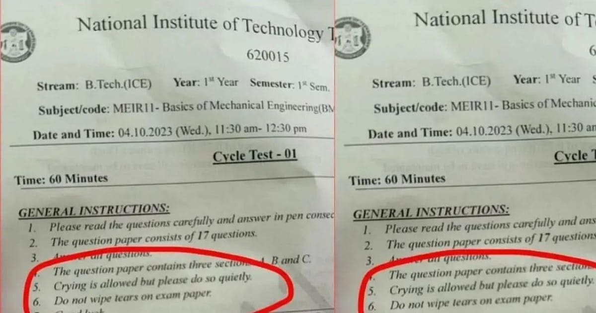 ಆದರೆ, ಇಲ್ಲೊಂದು ಪ್ರಶ್ನೆ ಪತ್ರಿಕೆಯಲ್ಲಿ ಅಳುವುದಕ್ಕೆ ಅನುಮತಿಯಿದೆ, ಆದರೆ ಸದ್ದಿಲ್ಲದೆ ಅಳಬೇಕು ಎಂಬ ಸೂಚನೆಯನ್ನು ನೀಡಲಾಗಿದೆ. ಇಂಜಿನಿಯರಿಂಗ್ ಕಾಲೇಜಿನ ಪ್ರಥಮ ವರ್ಷದ ಮೆಕಾನಿಕಲ್ ಇಂಜಿನಿಯರಿಂಗ್ ಬ್ಯಾಚ್ ಪ್ರಶ್ನೆ ಪತ್ರಿಕೆಯಲ್ಲಿ ಈ ಮಾರ್ಗದರ್ಶಿಯನ್ನು ನೀಡಲಾಗಿದೆ ಎನ್ನಲಾಗಿದ್ದು, ಅಳುವುದಕ್ಕೆ ಅವಕಾಶವಿದೆ. ಆದರೆ ದಯವಿಟ್ಟು ಸದ್ದಿಲ್ಲದೆ ಅಳಬೇಕಾಗಿದ್ದು, ಪ್ರಶ್ನೆ ಪತ್ರಿಕೆಯಲ್ಲಿ ಕಣ್ಣೀರು ಒರೆಸಬಾರದೆಂದು” ಸೂಚನೆ ನೀಡಲಾಗಿದೆ.ಈ ಮಾರ್ಗದರ್ಶಿಯನ್ನು ಒಳಗೊಂಡಿರುವ ಪ್ರಶ್ನೆಪತ್ರಿಕೆ ಸಾಮಾಜಿಕ ಜಾಲತಾಣಗಳಲ್ಲಿ ವೈರಲ್ ಆಗಿ ಭಾರೀ ಚರ್ಚೆಗೆ ಕಾರಣವಾಗಿದೆ. ಸದ್ಯ, ವೈರಲ್ ಪೋಸ್ಟ್ ಗೆ ತರಹೇವಾರಿ ಕಾಮೆಂಟ್ಸ್ ಗಳು ಹರಿದು ಬರುತ್ತಿದ್ದು, ಕೆಲವರು ಇದನ್ನು ಕಂಡು ನಕ್ಕರೆ, ಮತ್ತೆ ಕೆಲವರು ಪ್ರಶ್ನೆ ಪತ್ರಿಕೆ ಬಹಳ ಕಷ್ಟವಿರಬೇಕು ಎಂದು ಅಂದಾಜಿಸಿದ್ದಾರೆ.