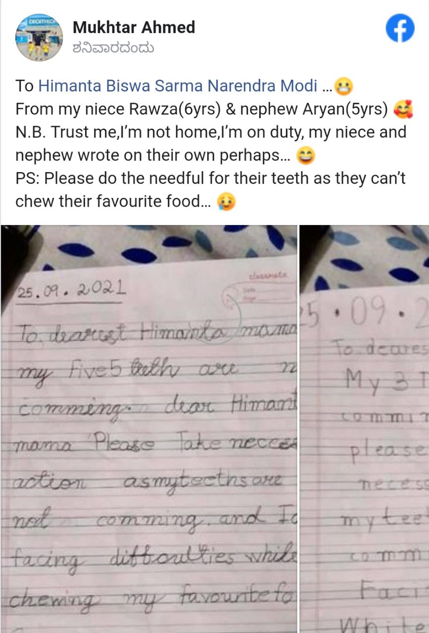 ಒಡಹುಟ್ಟಿದವರ ಪತ್ರಗಳನ್ನು ಅವರ ತಾಯಿಯ ಚಿಕ್ಕಪ್ಪ ಮುಖ್ತರ್ ಅಹಮದ್ ತಮ್ಮ ಫೇಸ್ಬುಕ್ ಖಾತೆಯಲ್ಲಿ ಹಂಚಿಕೊಂಡಿದ್ದಾರೆ ಮತ್ತು ಈಗ ಅವು ವೈರಲ್ ಆಗಿದ್ದು ನೆಟ್ಟಿಗರ ಹೃದಯ ಗೆದ್ದಿವೆ. ಅವರ ಚಿಕ್ಕಪ್ಪ ಪತ್ರಗಳ ಫೋಟೋ ತೆಗೆದು, “ಹಿಮಂತ ಬಿಸ್ವ ಶರ್ಮ, ನರೇಂದ್ರ ಮೋದಿಯವರಿಗೆ ನನ್ನ ಸೊಸೆ ರಾವ್ಜಾ (6 ವರ್ಷ) ಮತ್ತು ಸೋದರಳಿಯ ಆರ್ಯನ್ (5 ವರ್ಷ) ನನ್ನನ್ನು ನಂಬಿರಿ, ನಾನು ಮನೆಯಲಿಲ್ಲ, ನಾನು ಕರ್ತವ್ಯದಲ್ಲಿದ್ದೇನೆ. ನನ್ನ ಸೊಸೆ ಮತ್ತು ಸೋದರಳಿಯರು ತಮ್ಮದೇ ಆದ ರೀತಿಯಲ್ಲಿ ಬರೆದಿದ್ದಾರೆ. ದಯವಿಟ್ಟು ಅವರ ಹಲ್ಲುಗಳಿಗೆ ಏನಾದರೂ ಸಲಹೆ ಸೂಚನೆ ನೀಡಿ, ಏಕೆಂದರೆ ಅವರು ತಮ್ಮ ನೆಚ್ಚಿನ ಆಹಾರವನ್ನು ಜಗಿಯಲು ಸಾಧ್ಯವಾಗುತ್ತಿಲ್ಲ ಎಂದು ಬರೆದು ಶೇರ್ ಮಾಡಿಕೊಂಡಿದ್ದಾರೆ.