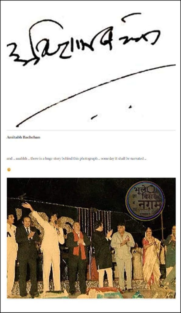 ಈ ಫೋಟೋದಲ್ಲಿ, ಅಮಿತಾಬ್ ಬಚ್ಚನ್ ಮತ್ತು ಅನೇಕ ತಾರೆಯರು ವೇದಿಕೆಯ ಮೇಲೆ ನಿಂತಿದ್ದಾರೆ. ಕೆಲವು ತಾರೆಯರು ಚಪ್ಪಾಳೆ ತಟ್ಟುತ್ತಿದ್ದಾರೆ. ಅಮಿತಾಬ್ ಗಾಳಿಯಲ್ಲಿ ಕೈ ಬೀಸುತ್ತಿದ್ದಾರೆ. ಅಮಿತಾಬ್ ಹೊರತಾಗಿ ನಟಿ ರೇಖಾ, ರಾಜ್ ಕಪೂರ್, ರಣಧೀರ್ ಕಪೂರ್, ವಿನೋದ್ ಖನ್ನಾ, ಮೆಹಮೂದ್, ಶಮ್ಮಿ ಕಪೂರ್ ಮತ್ತು ಸಂಗೀತ ನಿರ್ದೇಶಕ ಕಲ್ಯಾಣ್ ಈ ಫೋಟೋದಲ್ಲಿ ಕಾಣಿಸಿಕೊಂಡಿದ್ದಾರೆ.