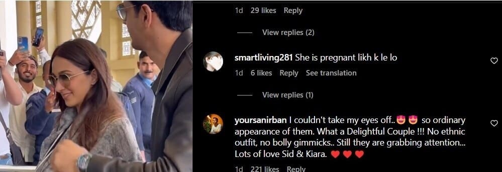 ಸದ್ಯ, ಕಿಯಾರಾ ಅಡ್ವಾಣಿ ಅವರ‌ ಈ ವಿಮಾನ ನಿಲ್ದಾಣದ ಲುಕ್ ಸೋಷಿಯಲ್ ಮೀಡಿಯಾದಲ್ಲಿ ಜೋರಾಗಿ ಸದ್ದು ಮಾಡುತ್ತಿದ್ದು, ಅಭಿಮಾನಿಗಳ ಪಾಲಿಗೆ ಚರ್ಚಾ ವಿಷಯವಾಗಿ ಮಾರ್ಪಟ್ಟಿದೆ.  ಕಪ್ಪು ಬಟ್ಟೆ ಧರಿಸಿ, ಈಗ ಶಾಲು ಹೊದ್ದು ಹೊಟ್ಟೆ ಮುಚ್ಚುವ ಸ್ಟೈಲ್ ಕಂಡ ನೆಟ್ಟಿಗರು ನಟಿಯ ಕಾಲೆಳೆಯುವ ಪ್ರಯತ್ನ ನಡೆಸಿದ್ದಾರೆ. ವೈರಲ್ ಆಗುತ್ತಿರುವ ಫೋಟೋ ನೋಡಿ ನೆಟ್ಟಿಗರು ನಾನಾ ರೀತಿಯ ಕಾಮೆಂಟ್ ಕೂಡ ಮಾಡುತ್ತಿದ್ದು, “ಈ ಮೇಡಮ್ 3-4 ತಿಂಗಳಲ್ಲಿ ಒಳ್ಳೆಯ ಸುದ್ದಿ ನೀಡಲಿದ್ದಿ, ಅವರ ಗರ್ಭಧಾರಣೆಯ ಸುದ್ದಿ ಶೀಘ್ರದಲ್ಲೇ ಬರಲಿದೆ ಎಂದು ನೆಟ್ಟಿಗರು ಪ್ರತಿಕ್ರಿಯೆ ನೀಡುತ್ತಿದ್ದಾರೆ.