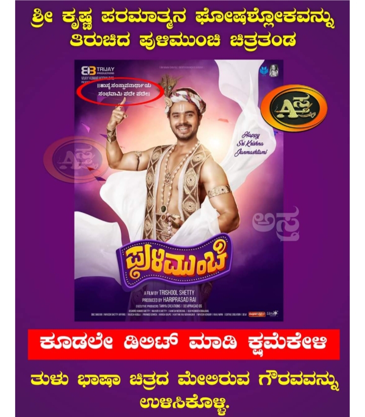 ಆರ್ ಜೆ ವಿನೀತ್ ಮುಖ್ಯ ಭೂಮಿಯಲ್ಲಿರುವ ಪುಳಿಮುಂಚಿ ಎಂಬ ತುಳು ಚಿತ್ರ ಟೈಟಲ್ ಬಿಡುಗಡೆಗೆ ಸಿದ್ಧವಾಗುತ್ತಿದೆ ಎನ್ನಲಾಗುತ್ತಿದೆ. ಈ ಸಂದರ್ಭದಲ್ಲಿ ಚಿತ್ರತಂಡವು ಒಂದಷ್ಟು ಕ್ರಿಯೇಟಿವಿಟಿ ಬಳಸಿ ಶ್ರೀ ಕೃಷ್ಣ ಜನ್ಮಾಷ್ಟಮಿಯ ಶುಭ ಹಾರೈಸಲು ಹೊರಟು ಎಡವಟ್ಟು ಮಾಡಿಕೊಂಡಿದೆ ಎನ್ನುವುದು ಆರೋಪ.