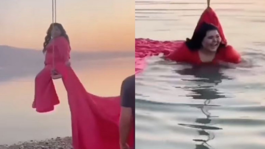 ಹೌದು, ಮಹಿಳೆಯೊಬ್ಬರು ನದಿಯ ದಡದಲ್ಲಿ ಸುಂದರವಾದ ಪಿಂಕ್ ಕಲರ್ ಲಾಂಗ್ ಡ್ರೆಸ್ ಅನ್ನು ಧರಿಸಿ, ಹೇರ್ ಸ್ಟೈಲ್ ಮಾಡಿಸಿಕೊಂಡು ತೂಗಾಡುವ ಉಯ್ಯಾಲೆಯ ಮೇಲೆ ಕುಳಿತುಕೊಂಡಿರುವುದನ್ನು ನಾವು ವೀಡಿಯೋದಲ್ಲಿ ಕಾಣಬಹುದಾಗಿದೆ. ಈ ಉಯ್ಯಾಲೆಯನ್ನು ಮರದ ಹಲಗೆಯಿಂದ ಸಿದ್ಧಪಡಿಸಲಾಗಿದ್ದು, ಅದನ್ನು ಹಗ್ಗದಿಂದ ನೇತಾಡುವಂತೆ ಕಟ್ಟಲಾಗಿತ್ತು. ನಂತರ ಫೋಟೋ ಶೂಟ್ ಮಾಡಿಸಲು ಮಹಿಳೆ ಉಯ್ಯಾಲೆ ಮೇಲೆ ಕುಳಿತು ಸ್ಟೈಲ್ ಆಗಿ ಕ್ಯಾಮೆರಾಗೆ ಪೋಸ್ ನೀಡುತ್ತಿರುತ್ತಾರೆ. ಅಲ್ಲದೇ ಫೋಟೋ ಸೆರೆಹಿಡಿಯುವ ವೇಳೆ ಮಹಿಳೆಯ ಲಾಂಗ್ ಡ್ರೆಸ್ ಅನ್ನು ದೂರದಿಂದ ವ್ಯಕ್ತಿಯೊಬ್ಬರು ಕೈಯಲ್ಲಿ ಹಿಡಿದು ಗಾಳಿಯಲ್ಲಿ ಅಲುಗಾಡಿಸಲು ಪ್ರಯತ್ನಿಸುತ್ತಾರೆ. ಆಗ ಮಹಿಳೆಯ ತೂಕಕ್ಕೆ ಉಯ್ಯಾಲೆ ಮುರಿದು ನೀರಿನಲ್ಲಿ ಬೀಳುತ್ತದೆ. ಇದೇ ವೇಳೆ ಉಯ್ಯಾಲೆ ಜೊತೆ ನೀರಿನೊಳಗೆ ಬಿದ್ದ ಮಹಿಳೆ ನೀರಿನಿಂದ ಮೇಲಕ್ಕೆ ಎದ್ದು ಸ್ವತಃ ತಾವೇ ಹೊಟ್ಟೆ ಹುಣ್ಣಾಗುವಷ್ಟು ನಕ್ಕಿದ್ದಾರೆ.