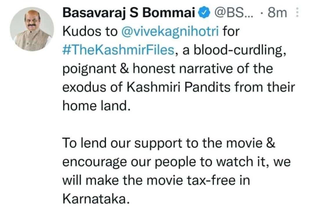 ಬೆಂಗಳೂರು: ‘ದಿ ಕಾಶ್ಮೀರ್ ಫೈಲ್ಸ್’ ಚಿತ್ರಕ್ಕೆ ಸಿಎಂ ಬೊಮ್ಮಾಯಿ ತೆರಿಗೆ ವಿನಾಯಿತಿ ಘೋಷಿಸಿದ್ದಾರೆ. ರಾಜ್ಯದ ಚಿತ್ರಮಂದಿರಗಳಲ್ಲಿ ಸಿನಿಮಾ ಪ್ರದರ್ಶನ ಮಾಡುವುದಕ್ಕೆ ಸಿಎಂ ಬೊಮ್ಮಾಯಿ ತೆರಿಗೆ ವಿನಾಯಿತಿ ಘೋಷಿಸಿದ್ದಾರೆ.