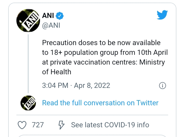 ಏಪ್ರಿಲ್ 10ರ ಭಾನುವಾರದಿಂದ 18 ವರ್ಷ ಮೇಲ್ಪಟ್ಟ ಎಲ್ಲಾ ವಯಸ್ಕರಿಗೆ ಖಾಸಗಿ ಕೋವಿಡ್ -19 ಲಸಿಕಾ ಕೇಂದ್ರಗಳಲ್ಲಿ ಬೂಸ್ಟರ್ ಡೋಸ್ ನೀಡಲಾಗುತ್ತದೆ ಎಂದು ಕೇಂದ್ರ ಆರೋಗ್ಯ ಸಚಿವಾಲಯ ಮಾಹಿತಿ ನೀಡಿದೆ.