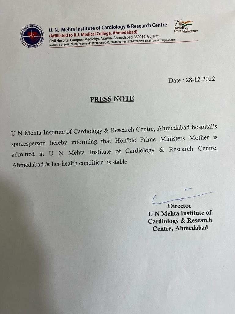Heeraben Modi, mother of Prime Minister Narendra Modi is admitted at UN Mehta Institute of Cardiology & Research Centre in Ahemdabad and her health condition is stable, says the hospital pic.twitter.com/D6N4PF2FGC