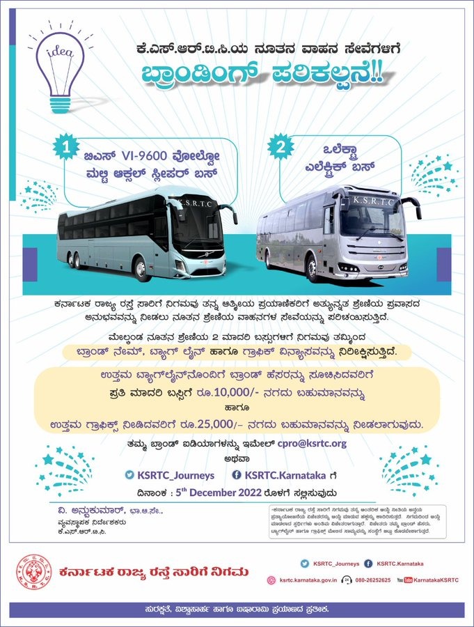ನೂತನ ಶ್ರೇಣಿಯ ಎರಡು ರೀತಿಯ ಬಸ್ಗಳಿಗೆ ತಮ್ಮಿಂದ ಸೂಕ್ತವಾದ ಬ್ರಾಂಡ್, ಹೆಸರು, ಟ್ಯಾಗ್ಲೈನ್ ಹಾಗೂ ಗ್ರಾಫಿಕ್ಸ್ ವಿನ್ಯಾಸಗಳನ್ನು ನಿರೀಕ್ಷಿಸುತ್ತಿದೆ. ಅಲ್ಲದೇ ಉತ್ತಮ ಟ್ಯಾಗ್ನೊಂದಿಗೆ ಬ್ರಾಡ್ ಹೆಸರನ್ನು ಯಾರು ಸೂಚಿಸುತ್ತಾರೆಯೋ ಅಂತಹವರಿಗೆ 10,000 ರೂಪಾಯಿ ನಗದು ಬಹುಮಾನವನ್ನು ಕೊಡಲಾಗುತ್ತದೆ ಎಂದು ಕೆಎಸ್ಆರ್ಟಿಸಿ ತಿಳಿಸಿದೆ.