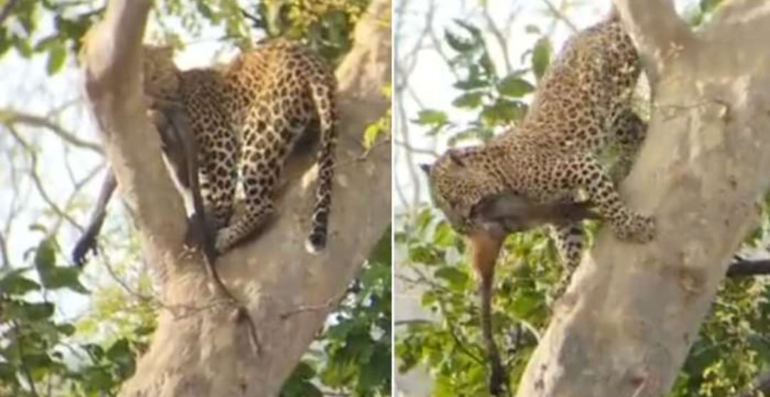 ಈ ವೀಡಿಯೋ ಕ್ಲಿಪ್ನಲ್ಲಿ ಹಸಿದ ಚಿರತೆ ಮರವನ್ನು ಹತ್ತಿ ಕೋತಿಯ ಮೇಲೆ ದಾಳಿ ಮಾಡುವುದನ್ನು ಕಾಣಬಹುದು. ಮರದಿಂದ ಇಳಿಯುವಾಗ ಚಿರತೆ ತನ್ನ ಬೇಟೆಯನ್ನು ಬಾಯಿಯಲ್ಲಿ ಬಿಗಿಯಾಗಿ ಹಿಡಿದುಕೊಂಡಿರುವುದು ಕಂಡುಬರುತ್ತದೆ.