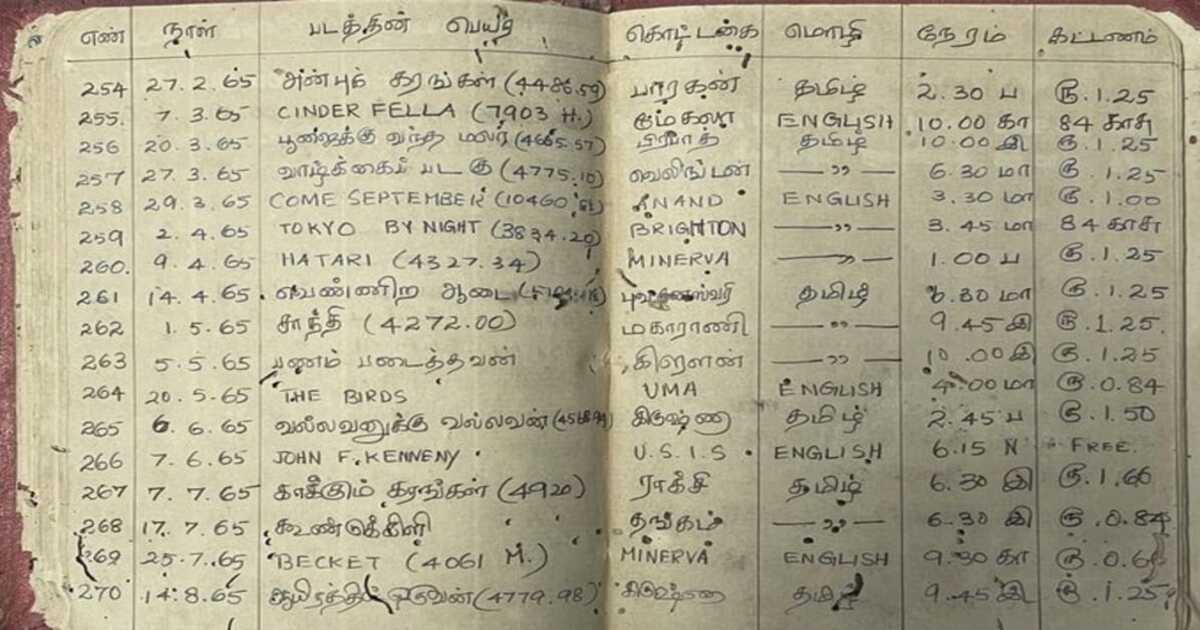 ಎ ಕೆ (@iamakshy_06) ಹೆಸರಿನ ಟ್ವಿಟರ್ ಬಳಕೆದಾರರು ಬಹಳ ಹಿಂದೆಯೇ ತಮ್ಮ ತಾತ ಅವರು ಥಿಯೇಟರ್ನಲ್ಲಿ ವೀಕ್ಷಿಸಿದ ಪ್ರತಿ ಚಲನಚಿತ್ರ, ಅದನ್ನು ವೀಕ್ಷಿಸಿದ ದಿನಾಂಕ, ಚಿತ್ರದ ಹೆಸರು, ಸಿನಿಮಾದ ಭಾಷೆಯನ್ನು ಅವರು ಬರೆದಿಟ್ಟಿದ್ದಾರೆ. ಅಷ್ಟೇ ಅಲ್ಲ, ಅವತ್ತು ಸಿನಿಮಾ ಪ್ರದರ್ಶನದ ಸಮಯ ಮತ್ತು ಅದನ್ನು ವೀಕ್ಷಿಸಿದ ಥಿಯೇಟರ್ ಅನ್ನು ಕೂಡಾ ನಮೂದಿಸಿದ್ದಾರೆ. ಅವರು ತನ್ನ ಸಿನಿಮಾ ವೀಕ್ಷಣಾ ದಿನಚರಿಯನ್ನು ಬಹಳ ಶ್ರಮದಿಂದ ನಿರ್ವಹಿಸುತ್ತಿದ್ದುದು ಅವರು ಬರೆದ ರೀತಿಯಿಂದಲೇ ಗೊತ್ತಾಗುತ್ತಿದೆ. ಅಚ್ಚುಕಟ್ಟಾಗಿ, ಟೇಬಲ್ ಹಾಕಿ ಬರೆದಂತೆ ಪ್ರತಿ ವಿಷ್ಯವನ್ನೂ ಅಲ್ಲಿ ನಮೂದಿಸಿದ್ದಾರೆ.