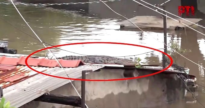 ವಡೋದರ ಅಕೋಟ ಕ್ರೀಡಾಂಗಣ ಪ್ರದೇಶದ ಸುತ್ತಮುತ್ತ ನೀರು ಆವರಿಸಿದ್ದು, ಮನೆಯ ಮೇಲ್ಛಾವಣಿವರೆಗೂ ನೀರು ನಿಂತಿದೆ. ಈ ಸಂದರ್ಭದಲ್ಲಿ ದೈತ್ಯ ಮೊಸಳೆಯೊಂದು ಮನೆ ಮೇಲ್ಛಾವಣಿಯಲ್ಲಿ ವಿಶ್ರಾಂತಿ ಪಡೆದಿದೆ.
