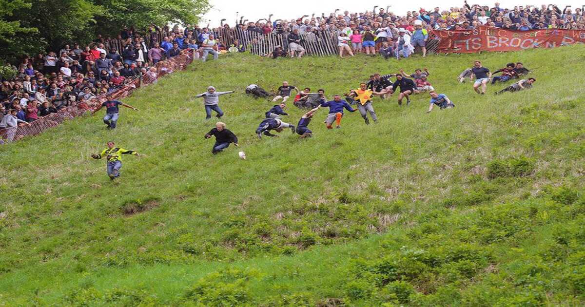 ಚೀಸ್ ರೋಲಿಂಗ್, ಇಂಗ್ಲೆಂಡ್: ಇಂಗ್ಲೆಂಡ್ನ ಗ್ಲೌಸೆಸ್ಟರ್ಶೈರ್ನಲ್ಲಿ ನಡೆದ ಉತ್ಸವದಲ್ಲಿ ಜನರು 8-ಪೌಂಡ್ ಡಬಲ್ ಗ್ಲೌಸೆಸ್ಟರ್ ಚೀಸ್ ಅನ್ನು ಬೆಟ್ಟದ ಕೆಳಗೆ ಉರುಳಿಸುತ್ತಾರೆ. ಓಟಗಾರರು ಅದನ್ನು ಹಿಂದಿಕ್ಕಲು ಬೆನ್ನಟ್ಟುತ್ತಾರೆ.