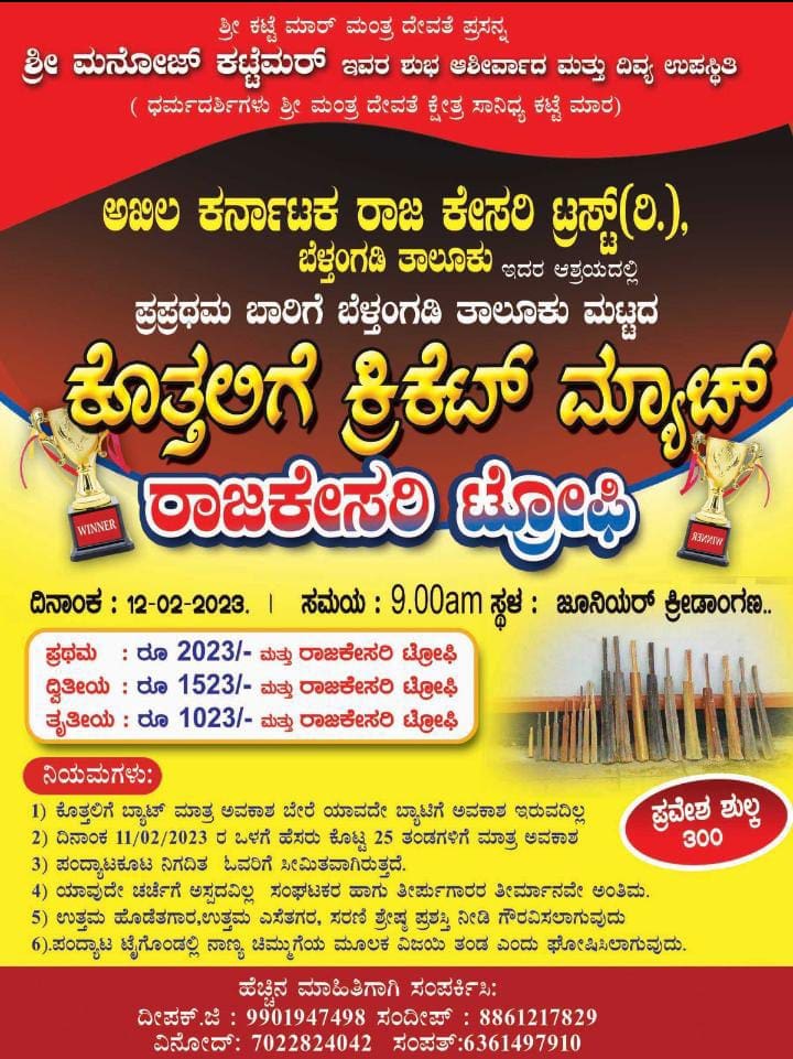 ದಕ್ಷಿಣ ಕನ್ನಡ ಜಿಲ್ಲೆಯ ಬೆಳ್ತಂಗಡಿ ತಾಲೂಕಿನಲ್ಲೇ ಈ ಕೊತ್ತಲಿಗೆ ಮ್ಯಾಚ್ ನಡೆಯಲಿದ್ದು, ಅಖಿಲ ಕರ್ನಾಟಕ ರಾಜಕೇಸರಿ ಟ್ರಸ್ಟ್(ರಿ.) ಬೆಳ್ತಂಗಡಿ ತಾಲೂಕು ಆಶ್ರಯದಲ್ಲಿ ಆಯೋಜಿಸಲಾಗಿದ್ದು, ಆಕರ್ಷಕ ನಗದು ಸಹಿತ ಟ್ರೋಫಿ ಬಹುಮಾನವಿಟ್ಟು ಆಟ ಆಡಿಸಲಾಗಿದೆ.