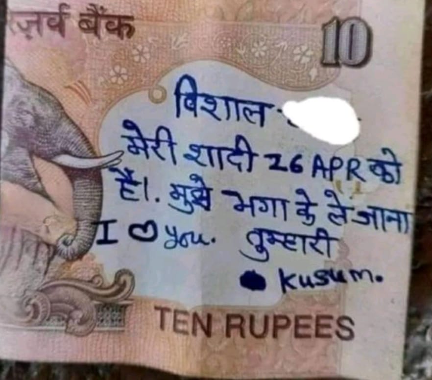 “ಏಪ್ರಿಲ್ 26ಕ್ಕೆ ನನ್ನ ಮದುವೆ, ದಯವಿಟ್ಟು ನನ್ನನ್ನು ಓಡಿಸ್ಕೊಂಡು ಹೋಗು…” | ಹತ್ತು ರೂಪಾಯಿಯ ನೋಟಿನಲ್ಲಿ ಪ್ರಿಯತಮೆ ಬರೆದ ಸಂದೇಶ ವೈರಲ್