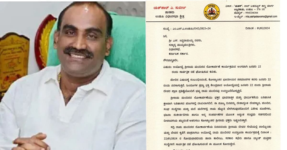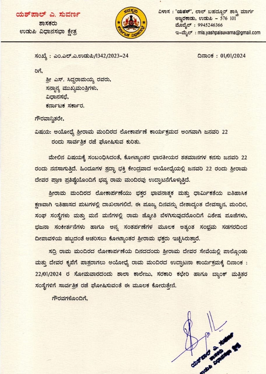 ಇಡೀ ದೇಶವೇ ಅಯೋಧ್ಯೆ ರಾಮ ಮಂದಿರ ಉದ್ಘಾಟನೆಯ ಲೋಕಾರ್ಪಣೆಯ ಭಾವನಾತ್ಮಕ ಐತಿಹಾಸಿಕ ಕ್ಷಣವನ್ನು ಕಣ್ತುಂಬಿಕೊಳ್ಳಲು ಕಾತುರದಿಂದ ಎದುರು ನೋಡುತ್ತಿದೆ. ಈ ನಡುವೆ, ಉಡುಪಿ ಶಾಸಕ ಯಶ್ಪಾಲ್ ಸುವರ್ಣರವರು, ರಾಮ ಮಂದಿರಕ್ಕೆ ಹೋಗಿಬರಲು ಮತ್ತು ಎಲ್ಲರೂ ರಾಮ ಮಂದಿರ ಉದ್ಘಾಟನೆ ದಿನವನ್ನು ಹಬ್ಬವಾಗಿ ಆಚರಣೆ ಮಾಡಲು ನೆರವಾಗುವ ನಿಟ್ಟಿನಲ್ಲಿ ಜ.22 ರಂದು ಸಾರ್ವತ್ರಿಕ ರಜಾ ದಿನವೆಂದು ಘೋಷಣೆ ಮಾಡುವಂತೆ ಮುಖ್ಯಮಂತ್ರಿ ಸಿದ್ದರಾಮಯ್ಯರವರಿಗೆ ಮನವಿ ಮಾಡಿದ್ದಾರೆ.